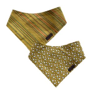Двостороння бандана виконана з 100% бавовни, з обох боків абсолютно різна по дизайну: одна сторона представляє собою жовтий фон і принт у вигляді білих зірочок; друга - гірчичний фон і принт в різнокольорові смуги. Застібається на шиї вихованця за допомогою двох кнопок, що підібрані під основні кольори виробу. А також доповнена коричневими шкіряними бірками, що нашиті вручну тональними нитками. Бандана зручна у посадці за рахунок пропрацьованого лекала та вигнутої горловини. Це той випадок, коли собаці в додатковій прикрасі буде зручно.