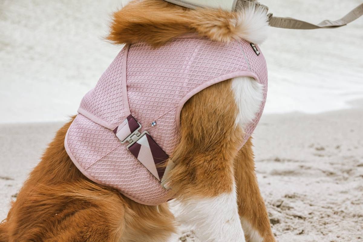 - Охолоджуючий ефект — завдяки випаровуванню води жилет знижує температуру тіла собаки природним способом.