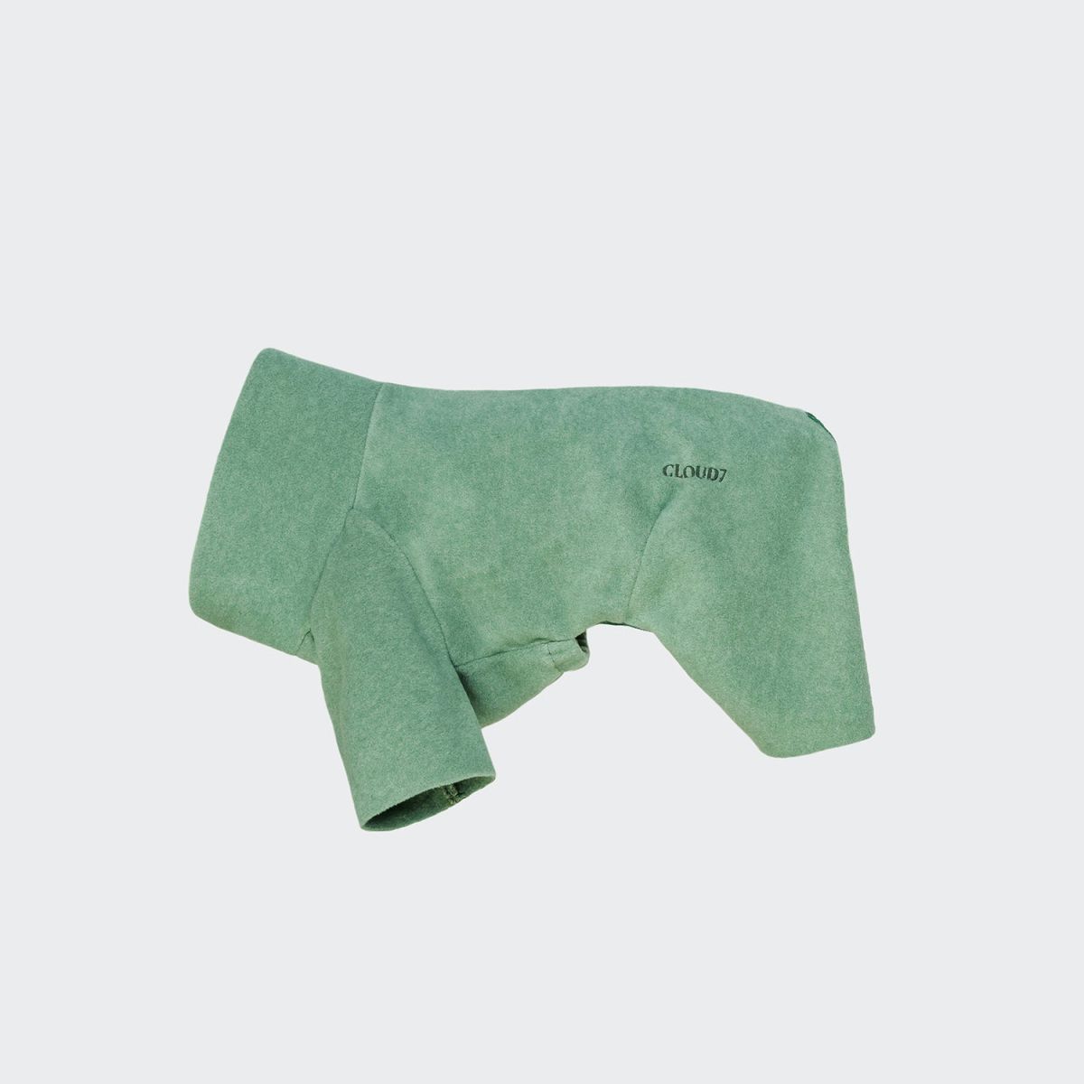 Затишний флісовий джампер для французів у відтінку пилової зелені, який також закриває лапи. Легкий у вдяганні, м’який светр із захистом живота має спеціальний крій для французьких бульдогів та мускулистих метисів.