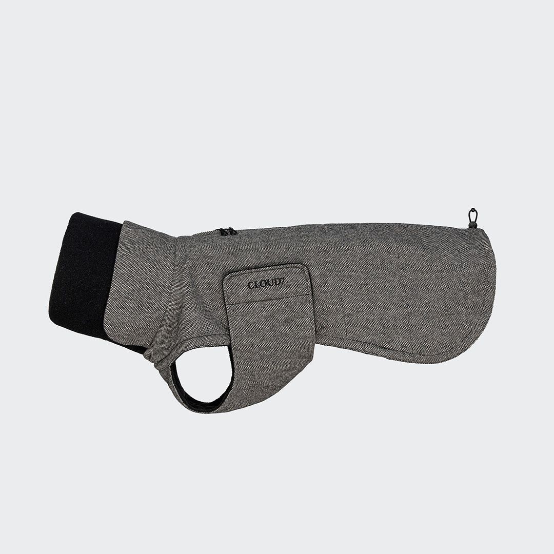 Пальто для хортів зі спеціальним вузьким кроєм, подовженою спинкою та захисною планкою на грудях, а також еластичними петлями для задніх лап для надійної фіксації. Виготовлене з водонепроникної, простотої в догляді італійської твідової тканини чорного кольору.