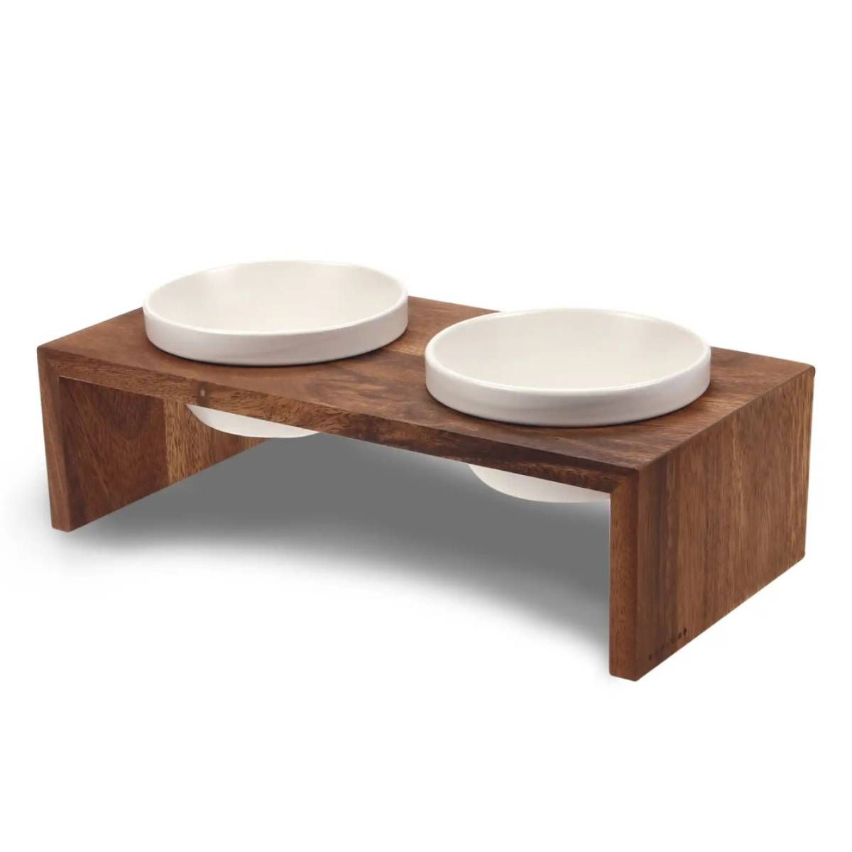 Основу виготовлено з відновлюваної натуральної деревини, отриманої з екологічно чистої плантації. Забарвлення виконане з використанням олії, без застосування хімічних барвників, що забезпечує безпеку для тварин та навколишнього середовища. Знімні миски для їжі виконані зі 100% кераміки. Через круглу форму вони особливо підходять для собак із плоскими мордами, таких як мопси або бульдоги.