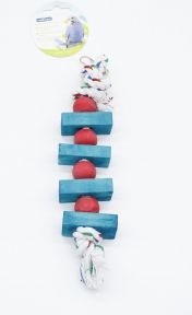 Натуральна іграшка для папуг, виготовлена з дерева та мотузки. Підходить для всіх видів папуг, допомагає сточувати дзьоб і розвивати активність. Легко кріпиться в клітці за допомогою карабіна. Рекомендується регулярно перевіряти стан мотузки та дерева, замінюючи іграшку при зносі для безпеки вихованця.
