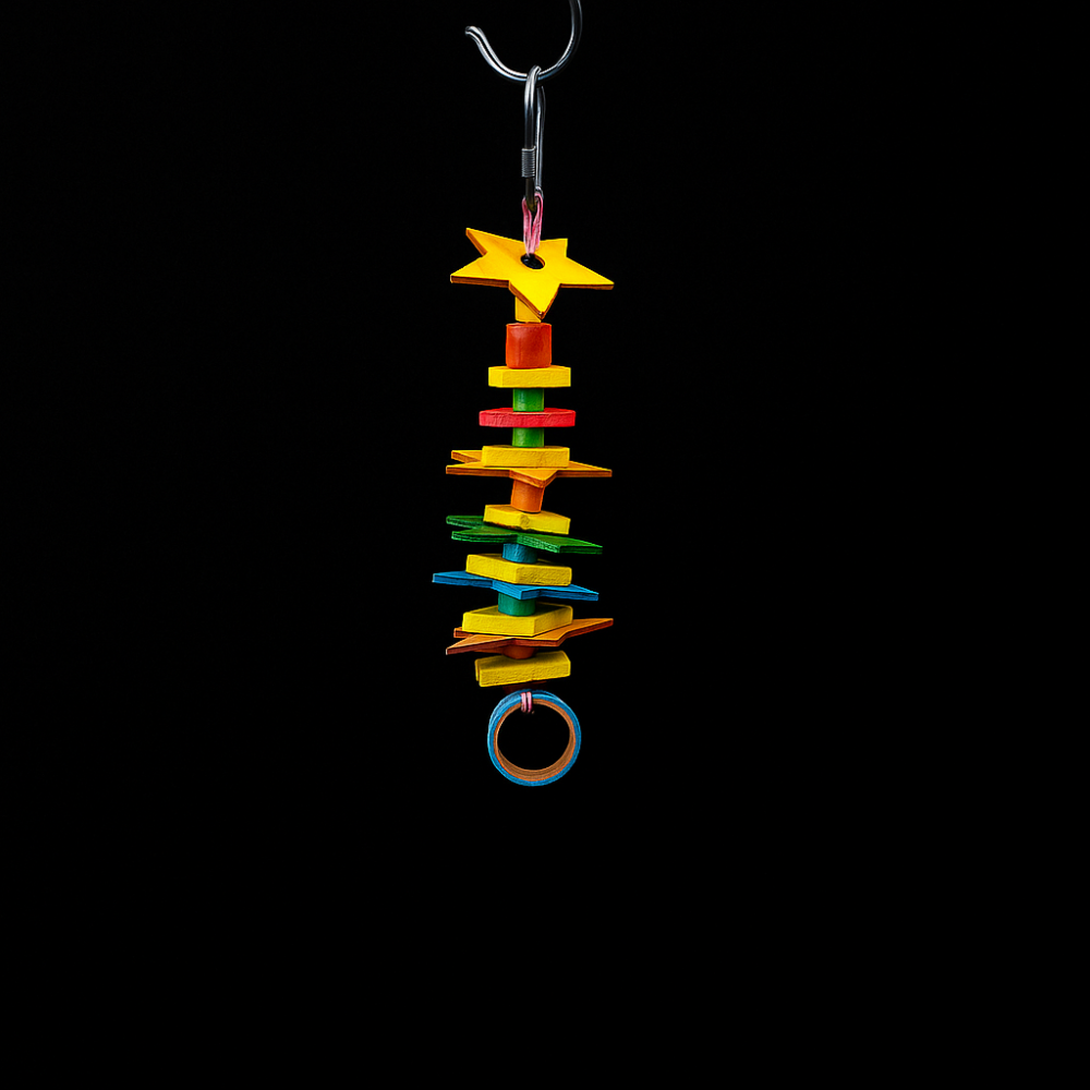Підвісна іграшка для папуг з деревяними деталями та дзвіночкомЯскрава та цікава іграшка, яка розважить вашого пернатого друга та допоможе йому залишатися активним. Вона складається з різнокольорових деревяних пластин і намистин, а внизу має дзвіночок, що надає інтерактивності та стимулює гру.Переваги:виготовлена із безпечних для птахів матеріалівдопомагає сточувати дзьоб природним шляхомпривертає увагу завдяки яскравим кольорамзручне кріплення-карабін для підвішування у клітціпідходить для хвилястих папуг, нерозлучників, корелів та інших декоративних птахів.