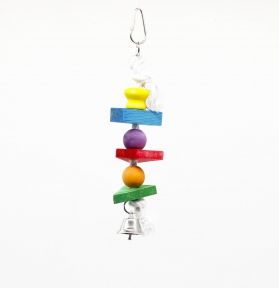 Підвісна іграшка для папуг з деревяними деталями та дзвіночкомЯскрава та цікава іграшка, яка розважить вашого пернатого друга та допоможе йому залишатися активним. Вона складається з різнокольорових деревяних пластин і намистин, а внизу має дзвіночок, що надає інтерактивності та стимулює гру.Переваги:виготовлена із безпечних для птахів матеріалівдопомагає сточувати дзьоб природним шляхомпривертає увагу завдяки яскравим кольорамзручне кріплення-карабін для підвішування у клітціпідходить для хвилястих папуг, нерозлучників, корелів та інших декоративних птахів.