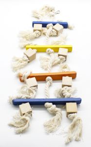 Підвісна іграшка в клітину для птахів виготовлена з натуральних матеріалів деревяні перекладини та брусочки, білі бавовняні канати. Оснащена надійним карабіном.Іграшка урізноманітнить дозвілля Вашого улюбленця і допоможе зберегти активність та товариськість.Також за допомогою такої іграшки папуга зможе сточувати дзьоб та кігтики, що дуже важливо для Вашого вихованця.Виготовлена з натуральних матеріалів відмінно підійде для середніх та великих папуг.
