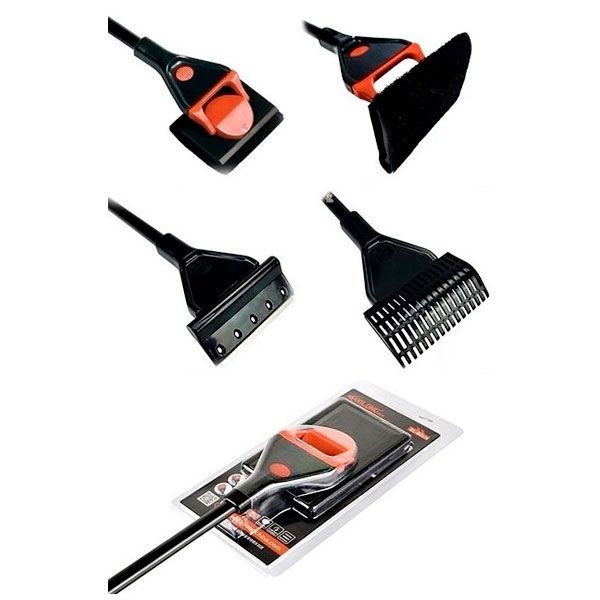 Багатофункціональний скребок для акваріума.Рукоятка із міцної металевої трубки з гумовою ручкою.Скребок має три насадки, що дозволяють чистити скло та розрівнювати грунт.Змінні насадки для скребка дозволять більш ніжно та якісно очистити скло або провести фінішне протирання.Використовуються для різного ступеня забруднення скла акваріума.