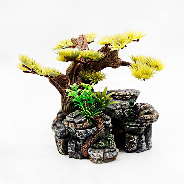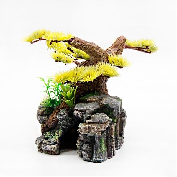 Декорація для акваріума Дерево бонсай на камені з печероюполіефірна смоламатеріал стійкий до дії морської водине впливає на якість води