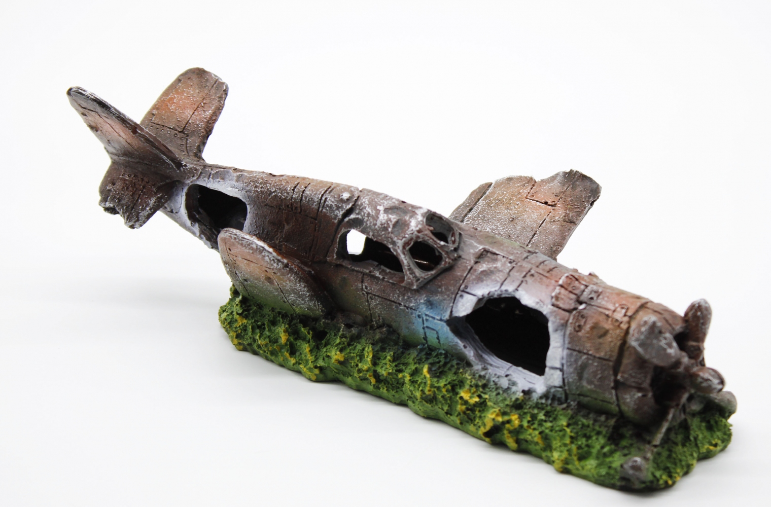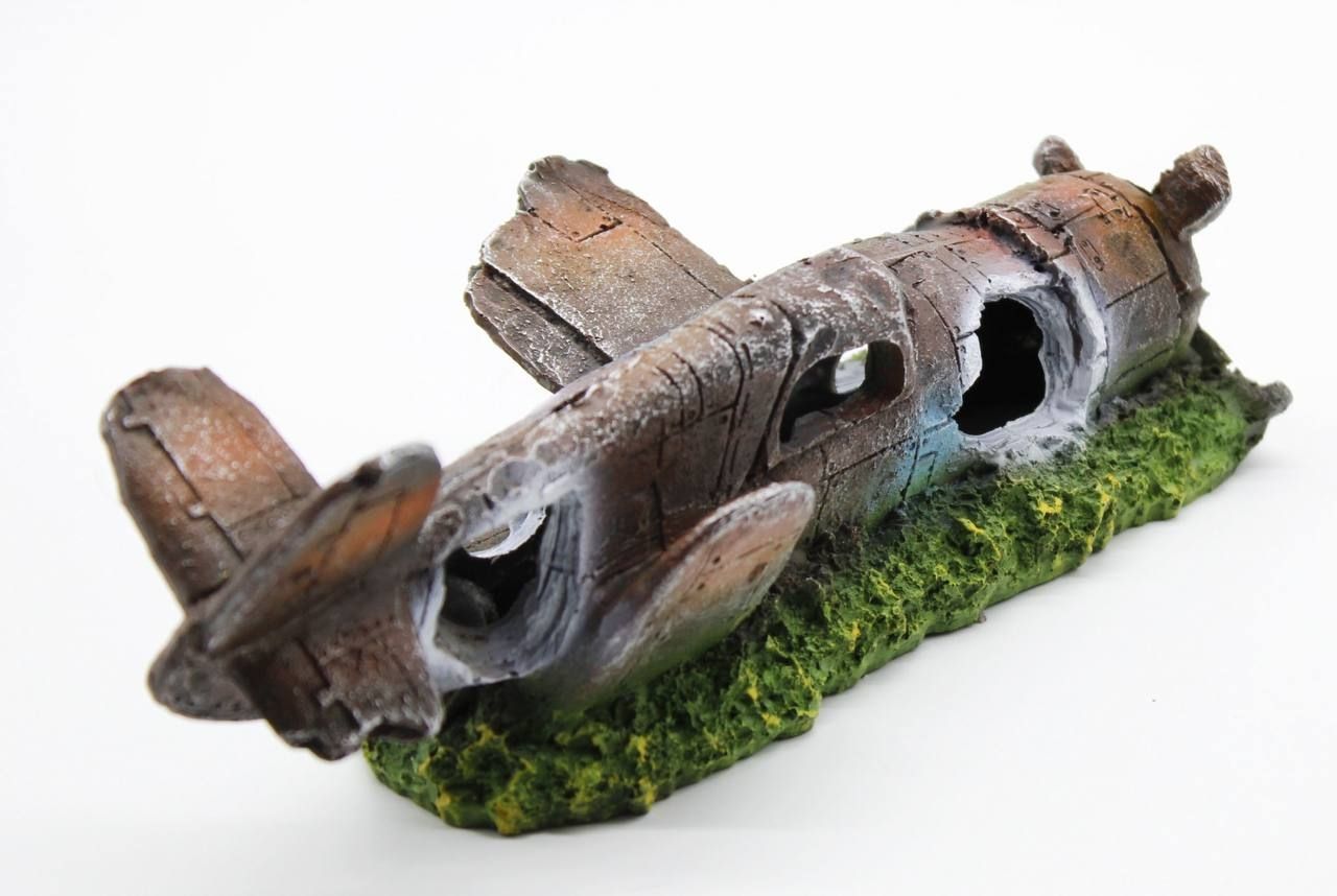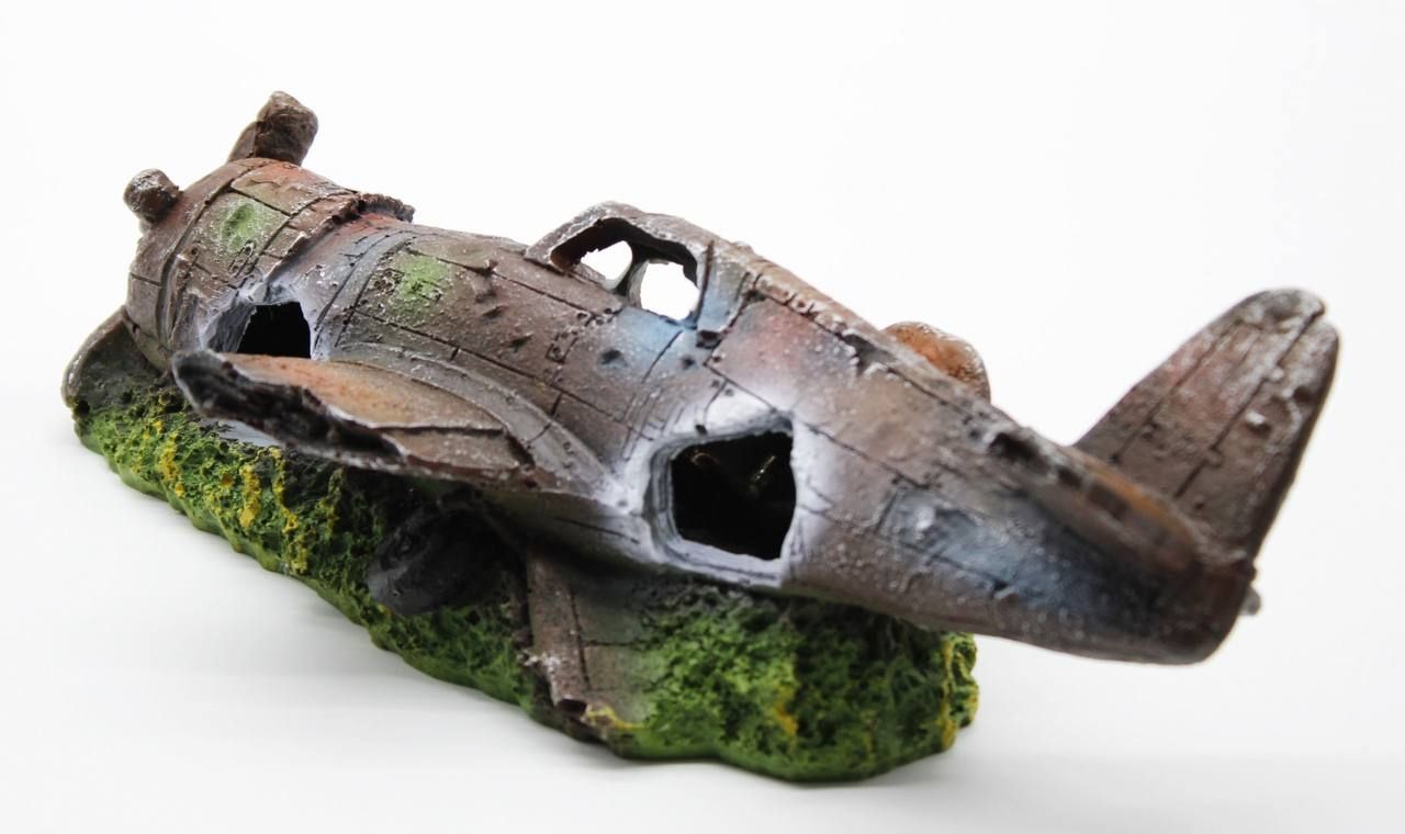Літак 2287 см декоративний елемент для акваріумів і тераріумів, виготовлений із якісної кераміки. Має вигляд затонулого розбитого літака, що додає акваріуму атмосфери пригод і таємничості.Кераміка безпечна для мешканців акваріума, не змінює склад води та легко очищується. Усередині є отвори, де можуть ховатися дрібні рибки або креветки. Така декорація стане ефектним акцентом у будь-якому акваріумі.