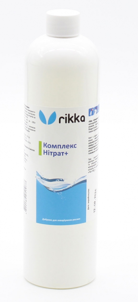 rikka Комплекс НІТРАТ+ - монодобриво для акваріумних рослин на основі біодоступного нітрата, а також органічного азоту.Азот є одним із найважливіших макроелементів у живленні акваріумних рослин. Дефіцит азоту призводить до недорозвинених листків, утворення маленьких пагонів та пожовклих молодих листків.При одночасному використанні Комплекс Макро та Комплекс Нітрат+ - контролюйте концентрацію нітратів за допомогою rikka Тест NO3.Спосіб застосування:Комплекс бажано використовувати щоденно, контролюючи концентрацію нітратів за допомогою тестів.Дозування: 1 мл на 100л акваріумної води. Для акваріумів з великою кількістю рослин дозування може бути збільшене.Склад: Нітрат - 74 гл Калій -46,5 гл Азот органічний - 8 гл.Обєм: 500мл
