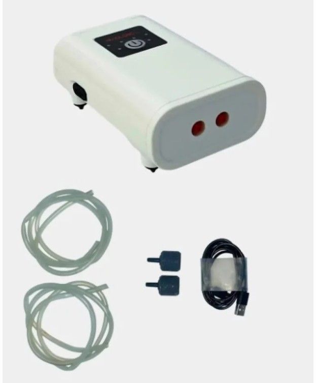 Акваріумний компресор на акумуляторі для акваріумів до 200 лЗабезпечує стабільний потік повітря. Працює від мережі, а також від акумулятора.Незамінна річ при вимкнення електроенергії.Акваріумний компресор має невеликий розмір, живлення від USB та акумулятора.Акваріумний компресор підходить для транспортування невеликої кількості риб.На корпусі компресора відображається заряд акумулятора у вигляді 4-х індикаторів синього кольору.Наприклад, якщо горить лише 2 лампочки, отже заряд акумулятора не більше 25-50, якщо 3 лампочки, то 50-75.Компресор має 2 режими роботи, постійний та інтервальний.При першому натисканні працює постійний режим, при другому натисканні інтервальний, 10 секунд подає повітря і 10 секунд не подає, в цьому режимі індикатор який знаходиться в лівому нижньому кутку, постійно блимає синім.Інтервальне подання повітря суттєво заощадить заряд акумулятора, компресор зможе пропрацювати до 18 годин без підзарядки.А на постійному режимі до 10 годин.Комплектація:Силіконовий шланг 46 мм 2 м, розпилювач повітря 2 шт, кабель Type-C 1 м.Рекомендації:Перед першим запуском компресора зарядіть акумулятор до повного заряду через блок живлення 5 В, час зарядки 6-8 годин.Якщо пристрій не використовується, заряджайте його раз на 3 місяці.Характеристики:Напруга: 110-240 СтПотужність: 2 ВтТиск: 0.024 МПаПродуктивність: 360 лгодинаДля акваріумів: до 200 лТривалість роботи: до 18 годиниРозміри (ДхШхВ): 12 х 8 х 4.6 см