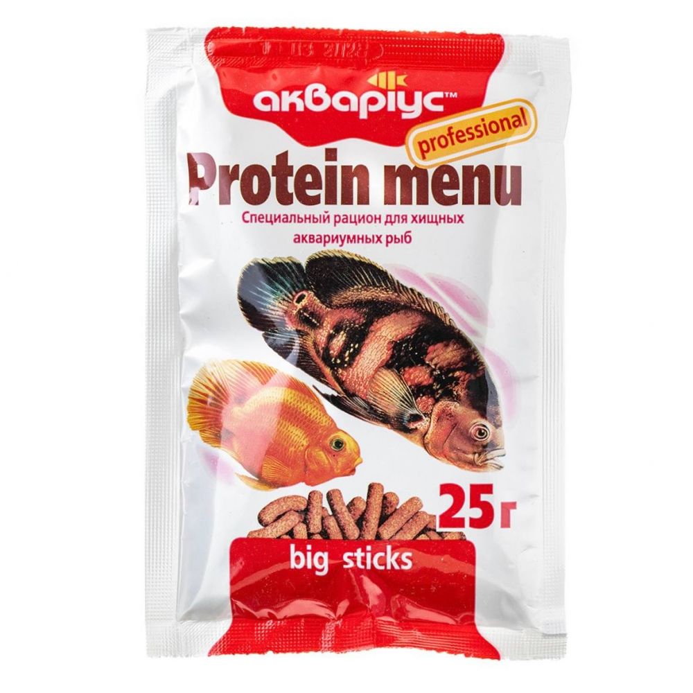 Корм PROTEIN MENU, big sticks (Протеїн меню, великі палички)- Інтенсивний раціон, призначений для щоденного годування хижих акваріумних риб, таких якретельно збалансований за вмістом поживних речовин, вітамінів і мінералів, корм забезпечує повноцінне годування риб протягом усього життя і не вимагає доповнення раціону іншими видами кормів.Корм PROTEIN MENU рекомендований для професійного розведення та вмісту риб. Підвищений рівень білоків і амінокислот тваринного походження, вітамінів і мінералів у раціоні прискорює ріст риб, зміцнює їх імунітет, стимулює розмноження і підвищує виживання потомства. Корм має відмінні смакові якості, чудово поїдається рибами. знешкодження бактерій, вірусів і паразитів, які спричиняють небезпечні хвороби акваріумних риб.Зміст:білка щонайменше 21,жиру 5,клітковини трохи більше 10.Застосування:годувати рибок слід 1-2 рази на добу з розрахунку 0,1-0,5 г на одне годування залежно від виду та розміру риби (норма для дорослої риби 2-5 корми від маси тіла). Якщо риба не зїла весь запропонований корм протягом 5-10 хвилин, його залишки слід витягти з акваріума, а наступного разу зменшити його кількість. При правильному застосуванні PROTEIN MENU не забруднює воду.Примітка:Не перегодовувати Деякі види риб мають схильність до переїдання, що може призвести до хвороби і, навіть, загибелі.Фасування:корм продається розфасованим у полімерні пакети по 40 і 10 г, та банки обємом 600 см та вагою 150 г.ТУ У 15.7-2284014277-001-2005 Термін придатності 12 місяців. Серія та дата виготовлення вказані на упаковці. Зберігати у сухому прохолодному місці при температурі від 0С до +30С та відносній вологості не вище 75