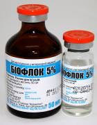 Вид тварин:Велика рогата скотСвиньиПушние звірі (лисиці, песці, норки, нутрії)КролиПрозрачная рідина світло-жовтого кольору.Состав1 мл препарату містить діючу речовину:енрофлоксацин - 50 мг. Допоміжні речовини: калій гідроксид, спирт бензиловий, вода для інєкцій.Фармакологічні свойстваЭнрофлоксацин належить до групи фторхінолонів і володіє широким спектром антибактеріальної дії, активний відносно грампозитивних і грамнегативних бактерій, у тому числі:Есегісіа coli,Salmonellaspp.,Klebsiellaspp.,Moraxellabovis, Pseudomonasaeruginosa, Pasteurella multocida, Staphylococcus aureus, Streptococcusspp., Haemophilusspp., Bordetellaspp., Campylobacterspp., Erysipelothriсspp., Corynebacteriumspp., Actinobacillusspp., Clostridiumspp., Bacteroidesspp., Fusobacteriumspp.,А також мікоплазм (Mycoplasmaspp.).Механізм протимікробної дії енрофлоксацину повязаний з інгібуванням активності ферменту ДНК-гірази, який пригнічує реплікацію бактеріальної ДНК в ядрі клітини.ПрименениеЛечение тварин, хворих септицемії, колібактеріозу, пастерельозу, мікоплазмоз, а також при захворюваннях шлунково-кишкового тракту (сальмонельоз, ентерит, гастрит), органів дихання (атрофічний риніт, хронічний синусит, бронхіт, бактеріальна та ензоотична пневмонія), сечостатевої системи (нефрит, пієлонефрит , уретрит, уроцистит, метрит, мастит, синдром мастит-метрит-агалактія), вуха (отит), шкіри і мяких тканин (виразки, абсцеси, нориці, інфіковані рани), транспортному синдромі, вторинних і змішаних інфекціях, спричинених мікроорганізмами, чутливими до енрофлоксацину.ДозировкаКрупний рогата худоба, телята, вівці, кози - підшкірно в дозі 0,5-1 мл на 10 кг маси тіла один раз на добу протягом 3-5 діб.Свині - внутрішньомязово в дозі 0,5-1 мл на 10 кг маси тіла один раз на добу протягом 3-5 діб, при синдромі мастит-метрит-агалактія препарат вводиться протягом 1-2 сутокПушние звірі (норки, лисиці, песці), собаки, кішки - підшкірно в дозі 0,1 мл на 1 кг маси тіла один раз на добу протягом 5 діб, при хронічних і важких захворюваннях курс лікування продовжують до 10 діб.Якщо обсяг дози перевищує 10 мл - для великої рогатої худоби, 5 мл - для телят, овець та кіз і 2,5 мл - для свиней, собак, кішок і хутрових звірів, її необхідно розділити і ввести в різні ділянки.При відсутності поліпшення клінічного стану після застосування препарату рекомендується провести повторну перевірку на чутливість мікроорганізмів до фторхінолонів або замінити Биофлок 5 іншим антибактеріальним препаратом.ПротивопоказанияПовишенная чутливість до енрофлоксацину.Не застосовувати тваринам з ураженням нервової системи та захворюваннями нирок.Забороняється застосовувати собак малих порід - в перші 12 місяців життя, великим породам - в перші 18 місяців життя, вагітним сукам і свиноматкам, а також сукам в період лактації.Не застосовувати одночасно з макролідами, тетрациклінами, левоміцетином, теофіліном та нестероїдними протизапальними засобами.ПредостережениеУбой тварин на мясо дозволяється через 14 діб після останнього застосування препарату.Споживання молока в їжу людям дозволяється через 4 доби після останнього застосування препарату.Отримані до зазначеного терміну мясо та молоко утилізують або згодовують непродуктивним тваринам, залежно від висновку лікаря ветеринарної медицини.Форма випускаФлакони зі скла, закриті гумовим корком під алюмінієву обкатку по 5, 10, 50 і 100 мл Скляні ампули по 1 і 2 мл ХранениеСухое темне, недоступне для дітей місце при температурі в