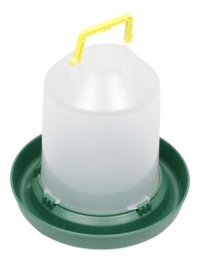 Напувалка БУНКЕРНА 5л з ручкою . Виготовлена з міцного пластику, діаметр піддону 30см, висота борту 5см, ширина піддону 4 см. Має надійну, зручну ручку з отвором для підвішування. Високий борт піддону запобігає розплескуванню води, підходить тільки для дорослого птаха. Обладнана герметичною пробкою, що загвинчується, що дозволяє заповнити напувалку водою без розбору всієї конструкції.