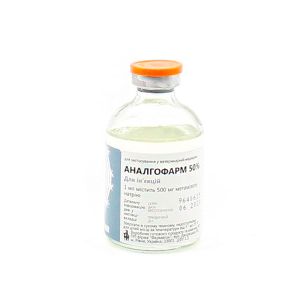 Аналгофарм (аналгін 50), 50 млОпис:Прозора рідина жовтуватого кольору.Склад:1 мл препарату містить діючу речовину:метамізолу натрію - 500 мгДопоміжні речовини: вода для інєкційФармокологічні властивості:Препарат має виражену анальгетичну, протисудомну (зменшує тонус гладких мязів), помірну протизапальну і жарознижувальну дію. В організмі тварин препарат зумовлює гальмування циклооксигенази, внаслідок цього діє на центральну і периферичну нервову системи. Після введення інтенсивність болю знижується без пригнічення перистальтики, тому при атонії, спазмах кишківника, метеоризмі препарат зумовлює заспокоєння тварин, вирівнювання перистальтики, відхід газів. При внутрішньомязовому введені знеболювальна дія триває протягом 1-2 годин, при внутрішньовенному починається через 10 хв. і триває приблизно 45-60 хв. Метаболіти препарату виводяться, в основному, з сечею.Застосування:Для лікування тварин при хворобах мязів та суглобів (артрити, кульгавість, бурсити, тенденіти, переломи), для зменшення болю різного походження, особливо при захворюваннях шлунково-кишкового тракту, як симптоматичне лікування при підвищеній температурі тіла, а також коням при міоглобінурії, коліках, невралгії, переповненні сечового міхура великій рогатій худобі, вівцям, козам для лікування маститу, при коліках, для післяопераційної анальгезії свиням при синдромі метрит-мастит-агалактія собакам при видаленні сторонніх тіл із глотки і стравоходу, перед обрізкою кігтів, вух, чисткою вух, ампутацією хвостів.Дозування:Вводять внутрішньовенно (повільно) або внутрішньомязово одноразово у наступних дозах:Вид тварин:Доза препарату:мг діючої речовиникг маси тіла:млголову:Коні20-5020-60Свині15-505-25Вівці, кози20-402-8Велика рогата худоба20-4020-50Телята20-405-15Собаки20-500,5-5При використанні дозу препарату підбирають в залежності від перебігу та типу захворювання.При необхідності швидкого знеболення препарат рекомендується вводити тваринам внутрішньовенно, перед введенням його підігрівають і вводять повільно.Невеликим тваринам та для подовження дії препарат вводять внутрішньомязово. При коліках у коней або інших захворюваннях тварин, що супроводжуються сильним болем, препарат необхідно вводити внутрішньовенно. Після закінчення дії препарату введення повторюють по показах.Протипоказання:Підвищена чутливість до метамізолу натрію.Не застосовувати котам тваринам з нирковою недостатністю.Застереження:При гострому розширенні шлунку під впливом препарату коні тимчасово заспокоюються, але розширення шлунку не зникає, тому одночасно з Аналгофармом призначають протибродильні засоби.Не вводити підшкірно.Забій на мясо дозволяється через 12 діб після останнього застосування препарату, споживання молока - через 3 доби. Отримане до зазначеного терміну мясо та молоко утилізують або згодовують непродуктивним тваринам, залежно від висновку лікаря ветеринарної медицини.Форма випуску:Ампули по 1 і 5 мл флакони із скла закриті гумовим корком під алюмінієву обкатку по 10, 50 і 100 мл.Зберігання:Сухе темне недоступне для дітей місце за температури від 5 С до 25С.Термін придатності -2 роки.