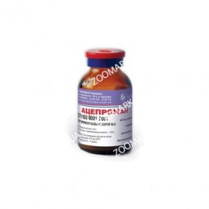 Опис АцепромалАцепромал випускається у формі розчину для інєкцій. Головне діюча речовина у складі препарату нейролептик, що чинить седативну дію ацепромазина малеат. Він знижує збудливість ЦНС, надає заспокійливу і міорелаксантну дію. Підсилює дію снодійних препаратів та анестезії, володіє антигістамінними, спазмолітичними та протиблювотними властивостями.Час дії препарату до однієї години або більше, в залежності від дозування. Ацепромал починає діяти через 5-8 хвилин при внутрішньовенному введенні та через 15-25 хвилин при внутрішньомязовому.Інструкція по застосуваннюАцепромал застосовується у ветеринарії в наступних випадках:премедикація перед хірургічними операціямив якості заспокійливого засобу для агресивних тварин перед транспортуванням або лікарським оглядомдля зниження больових відчуттівконям як спазмолитика.Препарат Ацепромал купити можна в нашому інтернет-магазині.