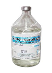 Бороглюкол 10(розчин для інєкцій)листівка-вкладкаОписПрозора, безбарвна або світло-жовтого кольору рідина з можливою легкою опалесценсією.Склад1 мл препарату містить діючу речовину:кальцію глюконат 100 мг.Допоміжні речовини: борна кислота, натрію тетраборат, вода для інєкцій.Фармакологiчнi властивостіПрепарат зменшуєпроникністькапілярів, має протизапальну, протиексудативну та протиалергічну дії, тонізує симпатичну нервову систему.Кальцію бороглюконат підвищує рівень кальцію в крові стимулює серцеву діяльність та обмінні процеси в організмі послаблює дію токсинів. Кальцій активізує ретикулоендотеліальну систему і підвищує фагоцитарну функцію лейкоцитів, прискорює зсідання крові, створюючи умови для перетворення протромбіну в тромбін.ЗастосуванняЛікування тварин при алергічних реакціях для зменшення проникності кровоносних судин та запобігання набрякам запальних ексудативних процесах екзематозних ураженнях шкіри пневмонії ендометриті остеодистрофії, рахіті, коліентеротоксемії (набряковій хворобі) поросят як кровоспинний засіб при паренхіматозних кровотечах як антидот при отруєнні солями магнію, токсичних ураженнях печінки.ДозуванняВнутрішньовенно повільно одноразово у дозах, з розрахунку на одну тварину:телята, лошата, вівці, кози: 50 100 мл препаратупоросята: 10 30 мл препаратусобаки: 5 30 мл препаратукоти: 5 15 мл препарату.Можливе повторне застосування препарату через 12 годин.Перед введенням препарат підігріти до температуритіла тварини.Телятам, вівцям, козам, поросятам препарат можна вводити внутрішньомязово, а собакам і котамперорально.ПротипоказанняНе застосовувати при гіперкальціємії, захворюваннях нирок, міокарду.Не застосовувати одночасно із глікозидами наперстянки і строфанту.ЗастереженняВводити повільно.Шприц перед наповненням не повинен містити залишків спирту, в присутності якого кальцій глюконат випадає в осад.У випадку внутрішньомязового введення можливе утворення невеликої припухлості.Форма випускуСкляні флакони, закриті гумовими корками під алюмінієву обкатку по 50, 100 і 200 мл.ЗберiганняСухе темне недоступне для дітеймісце при температурі від 5 до 25С.Термiн придатності 2 роки.Для застосування у ветеринарній медицині