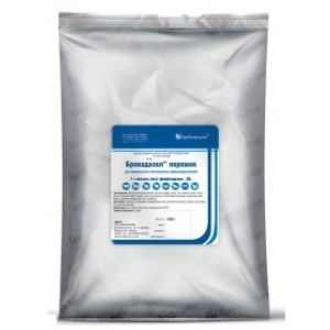 ОписМікрогранули, білого кольору без запаху і смаку, погано розчинний у воді.Склад1 г препарату містить діючу речовину:фенбендазол - 50 мг.Фармакологічні властивостіATCvetQP52A, протитрематодні, протинематодні і протицестодні ветеринарні препарати (ATCvetQР52АС13, фенбендазол).Механізм дії фенбендазолу повязаний з порушенням енергетичного обміну, руйнуванням мікроканальців травних клітин та появою нейротоксичного ефекту в гельмінтів. Фенбендазол також згубно діє на личинки різних стадій, а також порушує цілісність оболонок яєць гельмінтів. Останні при потраплянні у навколишнє середовище не спроможні в подальшому розвиватись.ЗастосуванняДегельмінтизація великої рогатої худоби, овець, кіз, свиней, коней, мясоїдних, хутрових звірів, курей, гусей при ураженні нематодами (зрілими і незрілими формами), деякими видами цестод і трематод і їх яйцями.ДозуванняДози і кількість разів застосування бровадазолу при індивідуальному лікуванні:Вид твариниі назва гельмінтозуРазова доза (мг кг маси тіла)Бровадазол5ДРЗастосуванняВелика рогата худобадиктіокаульоз, стронгілятози, стронгілоідоз20010разоводикроцеліоз66033разовоцистицеркоз500253 доби підрядДрібна рогата худобаЗмішана нематодозна інвазія30015разоводиктіокаульоз:субклінічна форма1005разовоклінічна форма30015разовомонієзіоз20010разовотрихуроз300152 доби підрядехінококоз, ценуроз800403 доби підряддикроцеліоз440222 доби підрядСвиніаскароз1507,52 доби підрядтрихуроз200102 рази на добуезофагостомоз і стронгілоідоз20010разовозмішана інвазія:поросята з 2-х до 8-ми тижневого віку201раз на тижденьматочне поголівя1507,52 рази на добуКоніпараскаридоз+ стронгілятоз30015разовостронгілоідоз (лошата 1-2 міс. віку)16082 доби підрядМясоїдні і хутрові звірізмішана інвазія30016разовоКурина птицюаскароз10052 доби підрядаскароз+гетеракідоз20010разовоГусинаптицюзмішана інвазія80040разовоПрепарат згодовують індивідуально або груповим методом. При груповій дегельмінтизації загальна кількість препарату збільшується на 2. Суміш корму з Бровадазолом задають на початку вранішньої годівлі.Перед масовою дегельмінтизацією кожну серію Бровадазолу попередньо випробовують на кількох тваринах, за якими спостерігають протягом доби. Дегельмінтизація дозволяється при відсутності ускладнень у цих тварин.ПротипоказанняБровадазол не можна застосовувати тваринам одночасно з протифасціольозними препаратами, а також протягом 7 діб після лікування тварин бромсаланами.ЗастереженняПісля останнього введення препарату забій тварин на мясо дозволяється:- велика рогата худоба, вівці, кози, свині - через 10 діб,- птиця - через 3 доби.Використання внутрішніх органів тварин (печінка, легені, серце) у їжу дозволяється через 20 діб.Молоко лактуючих тварин можна вживати в їжу через 2 доби після останнього застосування препарату.Форма випускуТріплексні пакети або пластмасові контейнери по 10, 25, 50 та 100 г поліетиленові або тріплексні пакети по 500 і 1000 г.ЗберіганняУ сухому темному місці при температурі до 25С.Термін придатності - 3 роки.