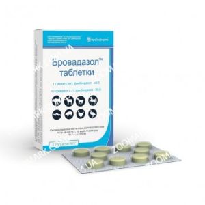 Склад1 г препарату (1 таблетка) містить:фенбендазол 50 мгОписТаблетки білого або світло-сірого кольору, круглої або овальної форми, пласкі.Фармакологічні властивостіФенбендазол належить до групи бензимідазолів, має високу антигельмiнтну активнiсть i широкий спектр дiї, знищує личинки зрiлих нематод, деякi види цестод i трематод та їхні яйця. Руйнує мікроканальці травних клітин гельмінтів і викликає у них нейротоксичний ефект. Згубно діє на личинки різних стадій та порушує цілісність оболонок яєць гельмінтів, після чого вони не здатні далі розвиватися.ПоказанняЛікуваннявеликої рогатої худоби, овець, кіз, свиней, коней, мясоїдних та хутрових тварин, курей, гусейпри ураженні зрілими і незрілими формами нематод, деякими видами цестод і трематод.ПротипоказанняНе застосовувати одночасно з протифасціольозними препаратами, а також протягом 7 діб після лікування тварин бромсаланами.Спосіб застосування та дозиПеред застосуванням таблетки подрібнюють, змішують з кормом і дають на початку ранкової годівлі.Дози препарату для різних видів тварин вказані в таблиці.Вид тварин і захворюванняДоза, табл. 10 кг маси тілаКурс застосуванняВелика рогата худоба:диктіокаульоз, стронгілятоз ШКТ, стронгілоїдоз2одноразоводикроцеліоз6,6одноразовоцистицеркоз53 дніДрібна рогата худоба:монієзіоз2одноразовотрихуроз32 дніехінококоз, ценуроз83 днідикроцеліоз4,42 дніСвині:аскароз1,52 днітрихуроз22 рази на добуезофагостомоз, стронгілоїдоз2одноразовоПоросятавіком 2-8 тижнів:аскароз, трихуроз0,21 раз на тижденьСвині (маточне поголівя):аскароз, трихуроз, езофагостомоз, стронгілоїдоз1,52 рази на добуКоні:параскаридоз, стронгілідоз і ціатостомідоз ШКТ, оксіуроз3одноразовоЛошатавіком 1-2 місяці:стронгілоїдоз1,62 дніМясоїдні та хутрові тварини:нематодози, цестодози3одноразовоКури:аскаридіоз1 (на 1 птицю)2 дніаскаридіоз, гетеракідоз2 (на 1 птицю)одноразовоГуси:нематодози, цестодози8 (на 1 птицю)одноразовоЗастереженняПісля останнього застосування препарату забій великої рогатої худоби, овець, кіз, свиней на мясо дозволяється через 10 діб, птиці через 3 доби. Людям вживати в їжу печінку, легені, серце тварин можна через 20 діб, молоко через 2 доби.Умови зберіганняУ сухому, темному місці за температури до +25 С.Термін придатності3 роки.