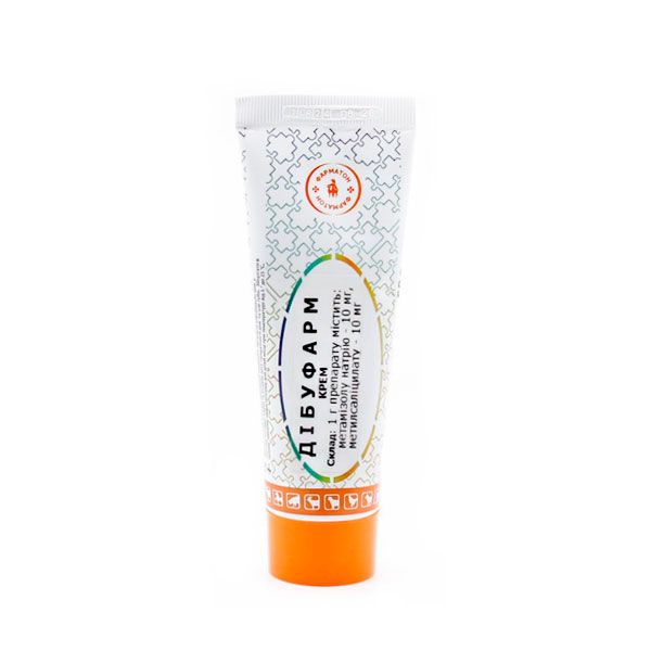 Опис:Мазь білого кольору зі специфічним запахом.Склад:1 г препарату містить:метамізолу натрію 10 мгметилсалицилат 10 мг. Допоміжні речовини: гліцерин, диметилсульфоксид, метилпарагідроксибензоат, мазева основа.Фармакологічні властивості:Мазь Дибуфарм має протизапальну, зігріваючий, протинабрякову та знеболювальну дії.Застосування:Для лікування та профілактики при маститах, артритах, міозитах і травмах різного походження.Дозування:Мазь наносять тонким шаром на шкіру 1-2 рази на добу, злегка втираючи.При лікуванні хвороб травматичного або запального характеру необхідно наносити мазь на пошкоджене місце не менше двох разів на добу.Допускається тривале застосування препарату.Протипоказання:Індивідуальна чутливість до компонентів препарату, захворювання печінки, нирок.Форма випуску:Пластикові контейнери або туби по 50, 100 р. Зберігання:Сухе, темне, недоступне для дітей місце при температурі від 5 до 25С.Термін придатності:2 роки.Для застосування у ветеринарній медицинеПроизводитель готового продукту:ПП фірма Фарматон, 33000, Україна, р. Рівне, вул. Дворецька, 89.