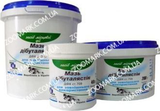 густа однорідна маса білого кольору зі специфічним запахом.Склад:анальгін, метилсаліцилат, диметилсульфоксид, мазева основа.Фармакологічні властивості:мазь дібуталястін має протизапальну, зігріваючу та протинабрякову дію.Застосування:мастити, артрити, міозити, забиття, тощо.Мазь наносять тонким шаром, злегка втираючи, на уражену ділянку шкіри.Протипоказання:індивідуальна чутливість до компонентів препарату, захворювання печінки, нирок.Каренція:продукцію тваринництва використовують без обмеження.Форма випуску:полімерні контейнери по 40, 200, 400 г.Зберігання:темне мiсце при температурі 0-25 С.Термін придатності:2 роки.Виробник:ДЕВІЕ.