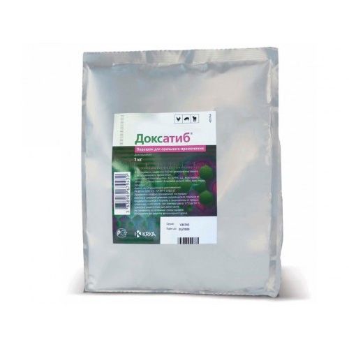 Опис ДоксатибаПорошок жовтуватого забарвлення, антибіотик широкого спектру дії в ветеринарії.Принцип діїПрепарат чинить згубний ефект на синтез білка мікробної клітини, внаслідок цього злоякісна бактерія не зберігає цілісну структуру позбавляється можливості клітинного поділу.Діюча речовина Доксицикліну гиклат добре вбирається у мікрофлору шлунка, тим самим швидко і рівномірно розподіляється по всьому організму. З організму ліки виводиться разом з каломЗастосуванняАнтибиотик назначают скотине, мясной птице и курам несушкам в помислах профилактики и лечения системи дихания, пищеварения, мочеполовой при инфекционних болезнях на первом или втором етапах развития.ПротивопоказанияДоксатиб не рекомендуется назначать свиноматкам в положении, скотине с развитими почечними болезнями, курам-несушкам за две недели о начала яйцекладки. Яйца и мясо телят, полученние до 2 недель после последнего применения препарата следует утилизировать, в пищу человеком не принимать.ДозировкаСредство вводят с питьевой водой групповим методом.Телятам 5мг ліки на 1 кг живої ваги Свиней 12,5 мг, птиці 20мг.Курс прийому 3-4 дніЛікувальний розчин готувати в день введення.