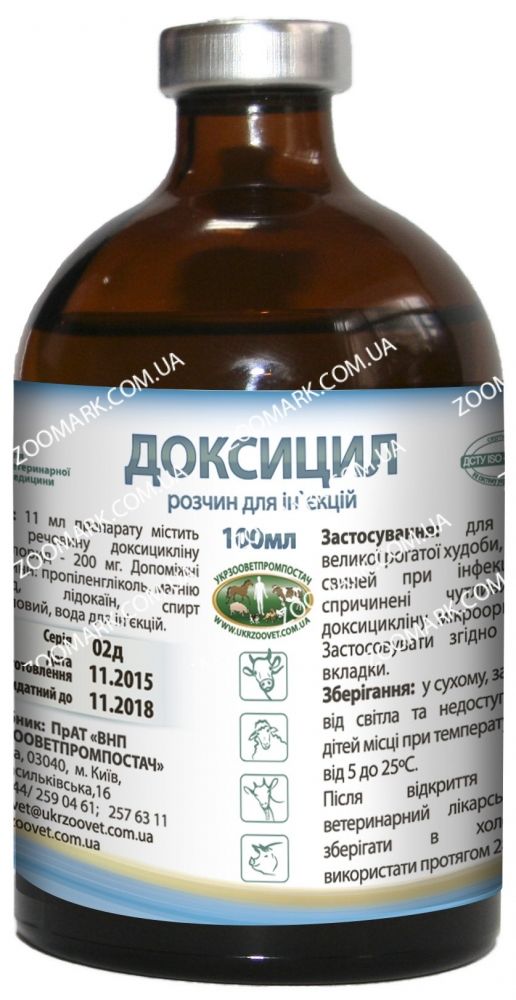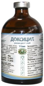 Доксицилрозчин для інєкційлистівка-вкладкаОписВязкий розчин від жовтого до коричневого кольору.Склад1 мл препарату містить діючу речовину доксицикліну гідрохлорид - 120 мг. Допоміжні речовини: пропіленгліколь, магнію хлорид, лідокаїн, спирт бензиловий, вода для інєкцій.Фармакологічні властивостіДоксициклін, що входить до складу препарату, відноситься до напівсинтетичних антибіотиків третього покоління тетрациклінової групи, активний проти грампозитивних і грамнегативних мікроорганізмів, в т.ч.Escherichia coli., Yersinia enterocolitica, Bordettela pertussis, Shigella spp., Haemophilus spp., Pasteurella spp., Salmonella spp., Staphylococcus spp., Streptococcus spp., Klebsiella pneumoniae, Leptospira spp., Clostridium spp., Listeria monocytogenes, Corynebacterium pyogenes , Erysipelothrix rhusiopathiae, Fusobacterium necroforum, Actinobacillus spp., Rickettsiae spp., Chlamidia spp, а такожMycoplasma spp.Механізм бактеріостатичної дії доксицикліну повязаний з пригніченням ензимів, що каталізують звязування аміноацетил - РНК з рибосомальними акцепторами, що призводить до блокування взаємодії аміноацилтранспортної РНК з матричною РНК і порушення синтезу білка мікробної клітини.Після парентерального введення препарату доксициклін добре і швидко всмоктується з місця інєкції, досягаючи терапевтичних концентрацій через 0,5-1 годину легко проникає в більшість органів і тканин тварини, метаболізується в печінці з утворенням неактивних метаболітів. Виводиться з організму головним чином з жовчю і частково з сечею.Доксицил за ступенем впливу на організм відноситься до помірно небезпечних речовин (3 клас небезпеки по ГОСТ 12.1.007-76), в рекомендованих дозах добре переноситься тваринами, не володіє ембріотоксичними, тератогенними і гепатотоксичними властивостями.ЗастосуванняДоксицил застосовують для лікування великої рогатої худоби, овець, кіз, свиней та собак при інфекціях, що спричинені чутливими до доксицикліну мікроорганізмами, у тому числі при колібактеріозах, сальмонельозах, стафілококозах, пневмоніях, гемофільозах, ензоотичній пневмонії свиней, бешисі свиней, пастерельозах, копитній гнилі, ерліхіозі та бореліозі у собак, кератоконюнктивітах, раньових інфекціях, артритах, пупковому сепсисі, абсцесах, хламідіозах та інших захворюваннях бактеріальної та мікоплазмової етіології.ДозуванняДоксицил вводять тваринам внутрішньомязово одноразово в дозах:- велика рогата худоба, вівці і кози - 1,0 мл на 10 кг маси тварини (що відповідає 12 мг доксицикліну на 1 кг маси тіла тварини)- свині - 0,5 мл на 10 кг маси тварини (що відповідає 6 мг доксицикліну на 1 кг маси тіла тварини)- собаки - 0,25 мл на 10 кг маси тварини (що відповідає 3 мг доксицикліну на 1 кг маси тіла тварини).При необхідності лікарський препарат застосовують повторно через 48 годин після першої інєкції.У звязку з можливою больовою реакцією при введенні лікарського засобу в обємі, що перевищує для поросят і ягнят 2,5 мл, дорослих свиней, овець і телят 5 мл, для великої рогатої худоби 10 мл, інєкції слід проводити в кілька місць.Лікування собак при хламідійних інфекціях має тривати не менше 7 діб.Препарат слід застосовувати з обережністю телятам віком до 12 міс. і поросятам до 6 міс. у звязку з можливістю прояву побічних ефектів - больової реакції при введенні і набряків в місці інєкції.ПротипоказанняЛікарський препарат забороняється застосовувати тваринам у другій половині вагітності та в лактаційний період. Забороняється застосування лікарського препарату од