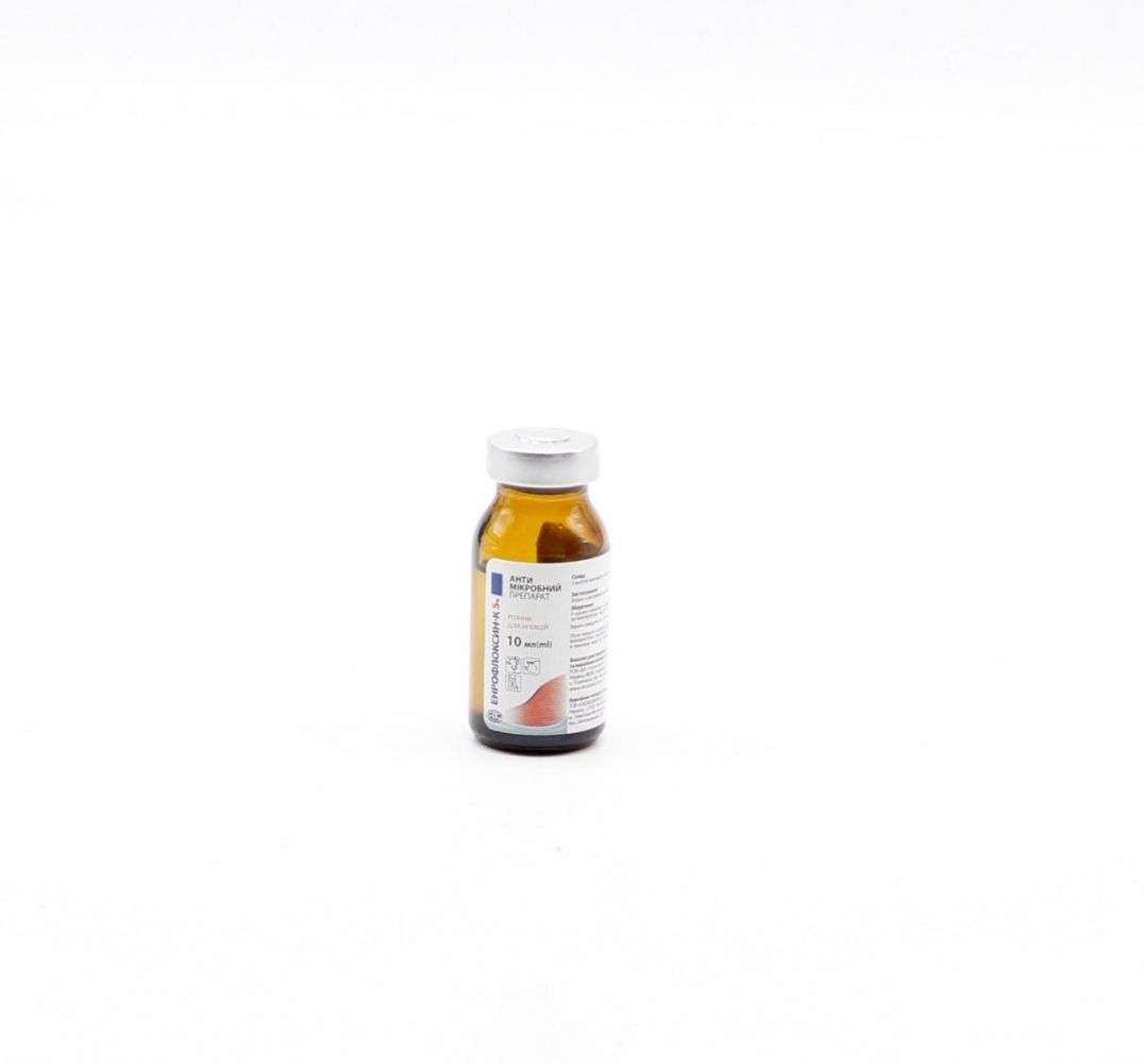 Антимікробний ветеринарний препарат Енрофлоксін-К 5Склад: 100 мл препарату містить діючу речовину: енрофлоксацин - 5 мФармакологічні властивості ЕнрофлоксінПрепарат належить до групи фторхінолонів. Гальмує активний фермент гіразу, яка бере участь в синтезі ДНК мікробної клітини, в результаті чого настає швидка бактерицидна дія, особливо на мікроорганізми, резистентні до бета-лактамних антибіотиків, тетрациклінів, макролідів та аміноглікозидів. Препарат ефективний проти грамнегативних і грампозитивних мікроорганізмів: Е. coli, Salmonella spp., Campylobacter spp, Haemophilus spp, Pasteurella spp, Bordetella spp, Erysipelothrix rhusiopathiae, Klebsiella spp, Staphylococcus aureus, Streptococcus spp. а також Mycoplasma spp.ПротипоказанняНе застосовувати тваринам з підвищеною чутливістю до енрофлоксацину, а також з ураженнями нервової системи та захворюваннями нирок. Забороняється застосовувати собакам дрібних порід в перші 12 місяців життя, великих порід у перші 18 місяців життя, вагітним сукам та свиноматкам, а також сукам в період лактації. Не застосовувати коням. Не застосовувати одночасно з препаратами тетрациклінового ряду, макролідами (еритроміцином), хлорамфеніколом, теофіліном.Енрофлоксін-К 5 спосіб застосування і дозування препарату 10 млПідшкірно або внутрішньомязово: велика рогата худоба -1,0 мл на 20 кг маси тіла 1 раз на добу протягом 2-3 діб собаки (підшкірно) - 1,0 мл на 10 кг маси тіла 1 раз на добу протягом 5-10 діб. Внутрішньомязово: свині - 1,0 мл на 20 кг маси тіла 1 раз на добу протягом 2-3 діб. При частих інфекціях дихальних шляхів, сальмонельозі великої рогатої худоби і свиней дозу подвоюють (1 мл на 10 кг маси тіла) 1 раз на добу протягом 5 діб.