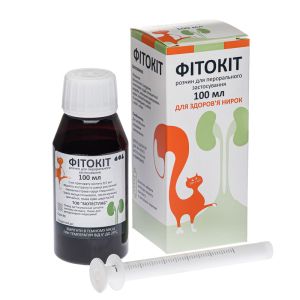 ОписРідина від світло-коричневого до темно-коричневого кольору із специфічним травяним запахом.склад1 мл препарату містить 0,5 мл водного екстракту (1:10) із суміші лікарської рослинної сировини:трава горця пташиного (спориш) 12,5 мгтрава хвоща польового 7,5 мглистя борошниці звичайної (мучниця) 5,0 мгтрава ерви шерстистої (півпалу) 25,0 мгДопоміжні речовини: пропіленгліколь, метилпарабен, пропілпарабен, вода очищена.ФармакологічнівластивостіМеханізм дії препарату Фітокот обумовлений активністю біологічно активних речовин лікарських рослин у складі препарату.ФІТОКОТ має діуретичну (сечогінну), салуретичну (солевивідну) і протизапальну діюрозчиняє каміння (крім оксалатів).Горець пташиний (Polygonum aviculare L., спориш)містить комплекс флавоноїдівдубильних речовинвітамінівсполук кремнієвої кислотимає сечогінні властивостісприяє відходженню конкрементів при сечокамяній хворобідіє протизапальнопокращує стан стінок капілярів.Хвощ польовий (Equisetum arvense L.) містить водорозчинні форми кремнієвої кислоти (до 25) та її комплекси з органічними сполукамифлавоноїдитритерпенові сапонінимає сечогіннукровоспиннимвираженою протизапальною дією.Борошниця звичайна (Arctostaphylos uva-ursi L.) містить глікозиди метиларбутин та арбутин, гідрохінон, галотанінурсолову, галову та еллагову кислотимає сечогінну, антисептичну, протизапальну, салуретичну дію.Підвищує діурез, виявляє антибактеріальні властивості за умови лужної реакції сечі.Ерва шерстиста (Aerva lanata L., пів-упала) містить флавоноїди, полісахариди, слиз, органічні кислоти, дубильні речовини, кумарини, сапонінимає діуретичну та салуретичну дію, що супроводжується збільшенням виділення іонів натрію та калію, зниженням вмісту сечовини в плазмі крові.ЗастосуванняФітокот застосовують для профілактики та лікування котів і собак при урологічному синдромі, сечокамяної хвороби, запальних захворювань нирок, сечового міхура та сечовивідних шляхів (пієліт, цистит, уретрит).ДозуванняДля лікування урологічного синдрому, початкових стадій сечокамяної хвороби, запальних захворювань нирок, сечового міхура та сечовивідних шляхів препарат застосовують у комплексі із симптоматичними засобами перорально 2 рази на добу, протягом 3-х тижнів у наступних дозах:Вид тваринВагаДоза,мл на тваринуКотидо 5 кг2 млбільше 5 кг4 млСобакидо 5 кг2 мл5-10 кг4 млбільше 10 кг8 млЗ профілактичною метою і щоб уникнути рецидивів захворювання, ФІТОКОТ застосовують перорально в тих же дозах, що і для лікування, один раз на добу, протягом 7-10 діб.Курс повторюють кожні 2-3 місяці.Препарат можна додавати у воду для випоювання.Відомості про несумісність препарату з іншими лікарськими засобами немає.ПротипоказанняНе застосовувати при гострій нирковій недостатності.ЗастереженняПризберіганнідопускається випаданняосаду, якийлегко розбиваєтьсяприструшуванні.ФормавипускуФлакони полімерні по 50, 100 мл у картонній коробці у комплекті зі шприцем-дозатором.ЗберіганняУ темному недоступному для дітей місці при температурі від 5С до 25С.Термін придатності препарату 2 роки.