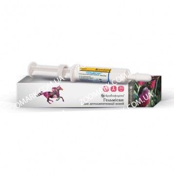 Склад1 мл препарату містить:пірантелу памоат 300 мгпразиквантел 20 мгОписГель світло-жовтого кольору, однорідний, без запаху.Фармакологічні властивостіПірантелу памоат похідна сполука пірімідину. Діє на круглих гельмінтів (статевозрілі та личинки 4 стадії) як деполяризуючий міорелаксант, який викликає нервово-мязову блокаду, що спричинює загибель нематод.Празиквантел похідна сполука хіноліну. Підвищує проникність клітинних мембран для іонів кальцію у цестод і трематод, що призводить до генералізованого скорочення мязів, паралічу гельмінтів та їхньої загибелі. Викликає вакуолізацію та пошкодження епітелію паразитів, в результаті вони стають чутливими до ферментів шлунково-кишкового тракту.ПоказанняПрофілактика та лікуванняконей, поні, куланів, коней Пржевальськогопри ураженні ендо- та ектопаразитами:нематодами ШКТ родин Ascaridae, Strongylidae, Cyathostomidae (Trihonematidae), Strongyloididae, Oxyuridae, Spiruridaeцестодами родини Anoplocephalidaeтрематодами родин Schistosomatidae, Dicrocoeliidaeличинками ґедзів Gasterophilus spp.ПротипоказанняНе призначати клінічно хворим та виснаженим тваринам, самкам в останній тиждень вагітності.Спосіб застосування та дозиПрепарат вводять за допомогою шприца-туби на корінь язика, одноразово. При інвазіях, спричинених личинками Trihostrongylus axei, двічі, через добу. Терапевтична та профілактична доза становить 1 г на 20 кг маси тіла.Профілактичну дегельмінтизацію дорослих коней проводять один раз на 3-4 місяці.Для дегельмінтизації диких тварин розраховану дозу змішують зі зволоженим комбікормом і згодовують під час ранкової годівлі індивідуально або груповим методом.ЗастереженняПісля останнього застосування препарату забій тварин на мясо дозволяється через 7 діб. Мясо, отримане раніше вказаного терміну, утилізують або згодовують непродуктивним тваринам залежно від висновку ветеринарного лікаря.Умови зберіганняУ сухому, захищеному від прямих сонячних променів, недоступному для дітей місці за температури від +1 до +25 С.Термін придатності2 роки.