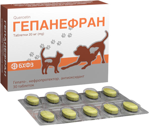 ГепанефранДіюча речовина:кверцетин 20 мг.Фармакологічні властивості Гепанефрану обумовлені вираженою антиоксидантною активністю кверцетину.Завдяки якій, разом з мембраностабілізуючою дією, виявляються гепатопротекторний, нефропротекторний та нтитоксичний ефекти.Препарат також має протизапальну, гастропротекторну, радіопротекторну та кардіопротекторну дії.Показання до застосуванняУ комплексному лікуванні гепато-, нефропатологій та загальної інтоксикації у собак та котів.Лікарська форма, упаковка:таблетки по 20 мг, по 10 таблеток у блістері, по 3 блістери у пачці.