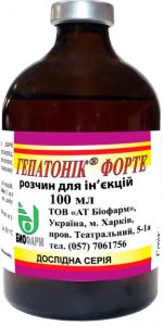 ОписПрозорий розчин рожевого кольору.Склад1 мл препарату містить діючі речовини (мг):карнітину гідрохлорид - 50,0ціанокобаламін (вітамін В12) - 0,03.Допоміжні речовини: кальцію пантотенат, нікотинамід, магнію сульфат, сорбіт, кислота бурштинова, вода очищена.Фармакологічні властивостіATC-vet класифікаційний код: QА05 Ветеринарні препарати, що застосовуються при патології печінки і жовчовивідних шляхів.ГЕПАТОНІК є комплексним стимулюючим препаратом, дія якого спрямована на поліпшення метаболічних функцій організму у тварин і птиці, підвищення резистентності, профілактика жирової дистрофії печінки, поліпшення показників конверсії корму, загальних показників обміну речовин і т.п.Карнітин є продуктом біосинтезу лізину і метіоніну. Карнітин стимулює процеси утилізації надлишків жирних кислот і транспорт внутрішньоклітинної енергії, сприяє підвищенню секреції і активності ферментів травних залоз, поліпшує апетит, прискорює ріст і збільшення маси тіла.Ціанокобаламін має виражену ліпотропну дію, попереджає жирову інфільтрацію печінки, сприяє синтезу лабільних метильних груп, активує продукування метіоніну, холіну, нуклеїнових кислот. Посилюючи синтез і накопичення протеїнів, володіє анаболічною дією. Покращує імунітет за рахунок підвищення фагоцитарної активності лейкоцитів і активізації діяльності ретикулоендотеліальної системи.Кальцію пантотенат в організмі перетворюється в пантетін, який входить до складу коензиму А, який, в свою чергу, присутній в метаболізмі білків, жирів і вуглеводів. Прискорює процеси окислення і біосинтезу жирних кислот, синтез ацетилхоліну, стероїдних гормонів, мукополісахаридів.Нікотинамід стимулює синтез нікотинамідаденіндинуклеотиду (НАД) і нікотинамідаденіндинуклеотид фосфату (НАДФ), що є кофакторами багатьох ферментів. У вигляді НАД та НАДФ присутній в окисно-відновних реакціях, забезпечуючи нормальний перебіг різних видів обміну, в тому числі і енергетичного.Магнію сульфат регулює обмінні процеси, нейрохімічну передачу і мязову збудливість. У малих дозах підвищує апетит і покращує травлення. Має жовчогінну дію.Сорбіт є енергетичним засобом, сприяє підвищенню глікогену в печінці.Кислота бурштинова покращує енергетичний обмін в клітинах, кровообіг, сприяє загальному зміцненню організму.Показання до використанняПрепарат застосовують для підвищення загальної резистентності організму, стимуляції обміну речовин, зниження ризику жирової дистрофії печінки, зменшення ризику негативного впливу стресових факторів при транспортуванні, вакцинації, зміні раціону і т.д., а також для прискорення росту тварин і птиці при відгодівлі.Препарат покращує показники конверсії корму за рахунок підвищення засвоєння кормів, стимуляції процесів травлення.Спосіб застосування та дозиЗастосовують з питною водою або кормом протягом 5-10 діб дозах:птиця: 1-2 мл препарату на 1 л питної води на добусвині (молодняк): 1-2 мл препарату на 1 тварину на добусвині (дорослі тварини): 15-40 мл препарату на 1 тварину на добу.При необхідності курс лікування можна продовжити до 21 діб.Розчин препарату використовувати протягом 24 годин.ПротипоказанняНе застосовувати одночасно з антибіотиками тетрациклінового ряду і при вакцинації пероральними вакцинами.Не застосовувати до тварин з підвищеною чутливістю до компонентів пр