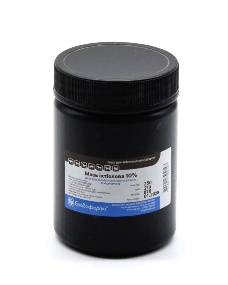 Склад1 г препарату містить:іхтіол 100 мгОписМазь темно-бурого кольору, кремоподібної консистенції, зі специфічним запахом.Фармакологічні властивостіІхтіол має протизапальну, місцеву знеболювальну та слабку антисептичну дію. При нанесенні на рани звужує периферичні кровоносні судини, зменшує ексудацію та прискорює регенеративні процеси.ПоказанняЛікуваннявеликої рогатої худоби, коней, овець, кіз, свиней, собак, котівпри дерматитах, фурункульозі, екземах, флегмонах, артритах, тендовагінітах, обмороженнях, термічних та хімічних опіках.ПротипоказанняНе застосовувати одночасно з алкалоїдами, препаратами для йодотерапії, солями важких металів.Спосіб застосування та дозиПрепарат застосовують зовнішньо після асептичної обробки ураженої ділянки шкіри. Мазь наносять тонким шаром на уражене місце 1-2 рази на добу. За потреби використовують марлеві повязки. Тривалість курсу лікування залежить від характеру захворювання.ЗастереженняПерсонал, що контактує з препаратом, повинен дотримуватись правил гігієни та безпеки, прийнятих при роботі з ветеринарними препаратами.Після нанесення мазі в область вимені молоко може набувати запаху іхтіола.Після останнього застосування препарату забій тварин на мясо дозволяється через 3 доби.Умови зберіганняУ сухому, темному місці за температури від +2 до +25 С.Термін придатності5 років.