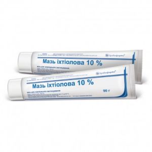 Склад1 г препарату містить:іхтіол 100 мгОписМазь темно-бурого кольору, кремоподібної консистенції, зі специфічним запахом.Фармакологічні властивостіІхтіол має протизапальну, місцеву знеболювальну та слабку антисептичну дію. При нанесенні на рани звужує периферичні кровоносні судини, зменшує ексудацію та прискорює регенеративні процеси.ПоказанняЛікуваннявеликої рогатої худоби, коней, овець, кіз, свиней, собак, котівпри дерматитах, фурункульозі, екземах, флегмонах, артритах, тендовагінітах, обмороженнях, термічних та хімічних опіках.ПротипоказанняНе застосовувати одночасно з алкалоїдами, препаратами для йодотерапії, солями важких металів.Спосіб застосування та дозиПрепарат застосовують зовнішньо після асептичної обробки ураженої ділянки шкіри. Мазь наносять тонким шаром на уражене місце 1-2 рази на добу. За потреби використовують марлеві повязки. Тривалість курсу лікування залежить від характеру захворювання.ЗастереженняПерсонал, що контактує з препаратом, повинен дотримуватись правил гігієни та безпеки, прийнятих при роботі з ветеринарними препаратами.Після нанесення мазі в область вимені молоко може набувати запаху іхтіола.Після останнього застосування препарату забій тварин на мясо дозволяється через 3 доби.Умови зберіганняУ сухому, темному місці за температури від +2 до +25 С.Термін придатності5 років.
