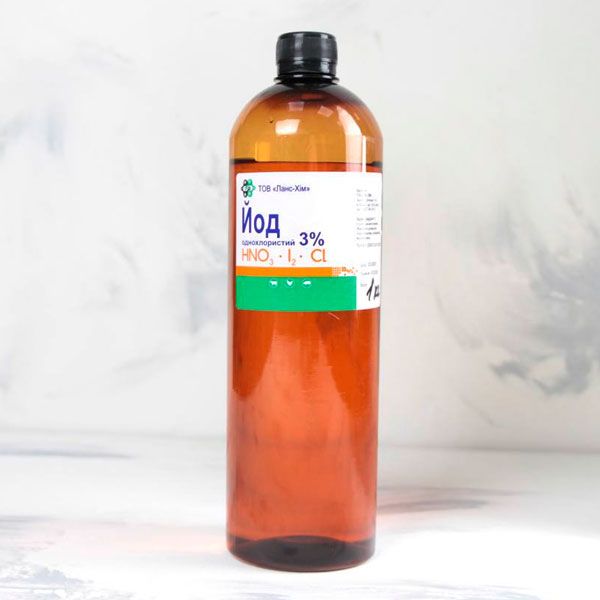 Опис Йод однохлористий 3Фармакологічна дія:Йод однохлористий, як і всі йод-хлорвмісні препарати, в оптимальних концентраціях володіє антисептичними, санирующими властивостями.Активний проти бактерій (в т. ч. мікобактерій), грибів, вірусів, яєць ряду гельмінтів, спір та ооцист кокцидій.Йод однохлористий призначають для вологої дезінфекції, дезінвазії поверхонь тваринницьких, птахівничих приміщень та обладнання до них, холодильних камер, знезараження шкаралупи яєць, а також для аерозольної дезінфекції повітря тваринницьких та птахівничих приміщень, лікування тварин, уражених стригучим лишаєм і преддоильной обробки вимені корів.Застосування:Проведення профілактичної, заключної та вимушеної дезінфекції приміщень та обєктів ветеринарного нагляду.Дозування:Вологу дезінфекцію, дезинвазию приміщень та інших обєктів проводять водними розчинами однохлористого йоду, які готують безпосередньо перед обробкою. При сибірці 10 розчином однохлористого йоду з розрахунку 1 лм2. Розчин наносять дворазово по 0,5 лм2 з інтервалом 15-25 хвилин. Експозиція 3 години. При негативних температурах (до мінус 40 С) зазначені розчини наносять на поверхню дрібно в три прийоми по 0,3 - 0,4 лм2. Перед кожним нанесенням дезінфікуючого розчину, поверхня попередньо обробляють гарячою водою (70 С) або насиченим (15 - 20 ) розчином кухонної солі з розрахунку 0,5 лм2. Експозиція після останнього нанесення дезрозчину 3 години.При інфекційному атрофічному риніті, бешисі свиней, вірусний гепатит каченят, ящуре (поточна дезінфекція) 5 розчином однохлористого йоду одноразово з розрахунку 0,5 лм2 з інтервалом 1 година.Експозиція у всіх випадках 6 годин. При інфекційної ентеротоксемії і брадзоте овець, туберкульозі тварин і птахів 10 розчином однохлористого йоду, підігрітим до 45 - 50 С, дворазово з інтервалом 1 годину в 0,5 лм2.Експозиція після другого зрошення 3 години. При респіраторному микоплазмозе птахів і сальмонельозах 3 розчином однохлористого йоду з розрахунку 1 лм2. Експозиція 1 година. При кокцидіозі кольок і птахів 10 розчином однохлористого йоду підігрітим до 70 С одноразово з розрахунку 1 лм2. Експозиція 5 годин. При параскаридозе коней і аскаридозі свиней 5 розчином однохлористого йоду, підігрітим до 70 С, з розрахунку 1 лм2. Експозиція 5 годин.При стронгилятозах і стронгилоидозах 3 розчином однохлористого йоду з розрахунку 1 лм2. Експозиція 1 година. При заразних хворобах гусениць тутового шовкопряда (мертвотність, чахлость, септицемія, жовтяниця) приміщення для відгодівлі гусениць (червоводни), інкубаційні зали, листохранилища і знаходиться в них обладнання за 6 днів до закладки грени шовкопряда, а також після закінчення відгодівлі гусениць і звільнення червоводен від коконів, 10 розчином однохлористого йоду з розрахунку 1 лм2.Експозиція 9 годин. Для запобігання корозійної дії доцільно проводити дезінфекцію металевого обладнання (окремо від поверхонь приміщень) однохлористим йодом, розчиненим у триетиленгликоле у співвідношенні 1 : 9 (до однієї частини препарату додають 9 частин триетиленгликоля) і ретельно перемішують. Отриманий таким чином 10 розчин маслянистої консистенції скорочено іменується Охлосан-Р.Аерозольну дезінфекцію повітря приміщень при виникненні респіраторних захворювань тварин (птахів) проводять одним із способів, наведених нижче.Шляхом розпилення 30 во