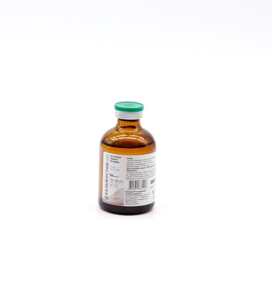 ОписПрозорий розчин із жовтуватим відтінком, без запахусклад100 мл препарату містить діючі речовини: кальцію глюконат 32,82 г, кальцію гліцерофосфат 8,13 г, магнію хлорид 4,18 г.Допоміжні речовини: борна кислота, цитрат натрію, вода для інєкцій.Фармакологічні властивостіКальфостим комплексний препарат.Дія препарату обумовлена фармакологічними властивостями діючих речовин, що входять до його складу.Кальцій бере участь у формуванні кісткової тканини (запобігає ризику розвитку рахіту та остеодистрофії), у процесі згортання крові, у регуляції процесів нервової провідності та мязових скорочень, у підтримці стабільної серцевої діяльності.Має загальнозміцнюючі, антитоксичні ефекти.Фосфор є одним з основних елементів кісткової тканини, нуклеопротеїнів та фосфоліпідів.Він бере участь у всіх процесах асиміляції в організмі тварини, що позитивно впливає на обмін речовин у тканинах організму.Магній бере участь в обміні фосфору та вуглеводів як кофермент.При парентеральному введенні блокує нервово-мязову трансмісію та запобігає розвитку судом.Кальфостим перебувають у фізіологічно обґрунтованому співвідношенні, добре і швидко всмоктуються при парентеральному введенні.Кальфостим малотоксичний, добре переноситься тваринами різного віку, в рекомендованих дозах не має місцево-подразнюючої, сенсибілізуючої, тератогенної та ембріотоксичної дії, не має кумулятивних властивостей.ЗастосуванняЛікування та профілактика тварин при захворюваннях, повязаних з порушенням метаболізму кальцію, фосфору та магнію:- гіпокальціємія (післяпологовий парез, рахіт у молодих тварин, остеомаляція у старих тварин)- різні форми тетанії (транспортна та пасовищна тетанія, тетанія під час вагітності та лактації)- алергія, токсикоз, післяродова гемоглобінурія, плямиста хвороба, кропивянка, екзантема, геморагічний діатез, гематурія та міоглобінурія- парез унаслідок дефіциту кальцію чи фосфору різної етіології- Допоміжна терапія при інтоксикації свинцем, фтором або щавлевою кислотою.ДозуванняПрепарат вводять внутрішньовенно, внутрішньомязово або підшкірно у дозі:Вид тваринДоза в мл на одну тваринуСпосіб введенняКоні масою до 500 кг80-100внутрішньовенноВелика рогата худоба масою до 500 кг (різного віку)80-100Внутрішньовенно.внутрішньомязово (максимальна доза для введення в одне місце - не більше 25 мл).Підшкірно (максимальна доза для введення в одне місце не більше 50 мл).Вівці, кози (різного віку)15-25Внутрішньовенно.внутрішньомязово (максимальна доза для введення в одне місце - не більше 15 мл).Підшкірно.Свині 15-25Внутрішньовенно.внутрішньомязово (максимальна доза для введення в одне місце - не більше 15 мл).Підшкірно.Поросята2-3Внутрішньомязово.ПідшкірноЗ лікувальною метою Кальфостим призначають тваринам одноразово.Допускається повторне застосування препарату через 24 години у дозах, зазначених у таблиці.Для профілактики порушень обміну кальцію, фосфору та магнію під час вагітності, лактації, а також рахіту молодняку сільськогосподарських тварин Кальфостим застосовують одноразово у рекомендованих дозах.ПротипоказанняГіперкальцемія, ацидоз, порушення функції нирок, надмірне нервове збудження, фібриляція серцевих шлуночків, підвищена чутливість до компонентів препарату.ЗастереженняОсоблива обережність при застосуванні для тварин із захворюваннями с