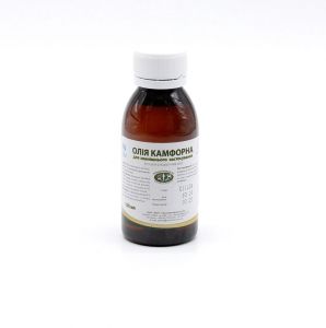 Олія камфорнаСклад100 мл препарату містить діючу речовину: камфору - 10 г.Форма випускуПолімерні флакони або пляшки:100 млФармакологічні властивостіПрепарат застосовують зовнішньо. При місцевому застосуванні помірно подразнює нервові закінчення, що проявляється спочатку відчуттям холоду, потім пекучості, зниженням чутливості й гіперемією. Також виражена бактеріостатична дія, особливо щодо кокових форм. Камфора добре всмоктується шкірою і виділяється із сечею, а також легенями і залозами шкіри.ЗастосуванняЛікування великої рогатої худоби, коней, овець, кіз, свиней, собак, котів при:артритібурситіміозитітендовагінітіревматичному запаленні мязів.ДозуванняПрепарат наносять тонким шаром на уражену поверхню і масажними рухами втирають протягом 2-3 хвилин 1-2 рази на добу до видужання.ПротипоказанняПідвищена чутливість до компонентів препарату.ЗастереженняНе застосовувати всередину.Не застосовувати перед забоєм та дійним тваринам, тому що мясо і молоко набувають запаху камфори.ЗберіганняУ сухому, темному, недоступному для дітей місці при температурі від 0 до 20С.Термін придатності - 1 рік.