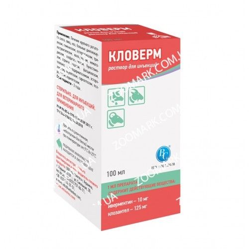Масляниста рідина від світло-жовтого до червоно-жовтого кольору.СКЛАД1 мл препарату містить діючої речовини:івермектин 10,0 мгклозантел 125,0 мг.ФАРМАКОЛОГІЧНІ ВЛАСТИВОСТІATCvet QP, протипаразитарні, репеленти та інсектицидні ветеринарні препарати (QP52AG09, Клозантел QPS4AA01, івермектин).Кловерм - комбінований препарат, до складу якого входять івермектин і клозантел.Івермектин належить до сполук, які продукуються мікроорганізмами групи Streptomices avermitis. Механізм дії івермектіна на організм паразита полягає в тому, що івермектин стимулює виділення ГАМК (гамма-аміномасляної кислоти), яка звязується зі спеціальними рецепторами нервових закінчень, блокуючи нервові імпульси, що викликає параліч і загибель паразита.Клозантел - похідний саліциланіду з протипаразитаюною дією. Механізм дії клозантелу полягає в пригніченні окисного фосфорилювання. Специфічна дія полягає в стимулюванні ферменту АТФ, що призводить до зупинки процесу фосфорилювання і перенесення електронів, змінюючи, таким чином, енергетичний метаболізм паразита, який призводить до його загибелі.ПОКАЗАННЯ ДО ЗАСТОСУВАННЯЛікування великої рогатої худоби, овець, кіз хворих діктиокаульозом, гемонхозом, остертагіозом, тріхостронгільозом, кооперіозом, нематодірозом, езофагостомозом, буностомозом, стронггільозом, фасциольозом, телязиозом, гіподерматозом, естрозом, сифункулятозом, саркаптозом, псороптозомі хоріоптозом, а саме:У великої рогатої худоби:- шлунково-кишковими та легеневими нематодами (дорослі і личинкові стадії) - Ostertagia spp., Haemonchus placei, Cooperia spp., Oesophagostomum radiatum, Trichostrongylus spp., Slrongyloides papillosas, Bunostomum phlebotomum, Toxocara vilulorum, Trichuris spp, Dictyocaulus viviparus (дорослі стадії), Nematodirus spp.- трематодами - Fasciola spp.- личинками оводів - Hypoderma bovis,Hypodermalineatum-коростяними кліщами- Psoroptes bovis,Sarcoptes bovis- вошами - Haematopinus eurysternus.У овець і кіз:- шлунково-кишковими та легеневими нематодами (дорослі і личинкові стадії) - Ostertagia spp., Haemonchus contortus, Trichostrongylus spp., Cooperia spp., Oesophagostomum spp., Nematodirus spp.,Trichostrongylusspp.,Bunostomumspp.,Chabertiaovina,Chabertiaovis,Trichurisovis,Dictyocaulusfilaria,Protostrongylusspp.-трематодами- Fasciola hepatica-коростяними кліщами- Psoroptes ovis, Sarcoptes ovis- овечим рунцом - Melophagus ovinus.СПОСІБ ЗАСТОСУВАННЯ ТА ДОЗИОдноразовов дозі, але не більше 8 мл в одне місце:- велика рогата худоба- 1,0 мл препарату 50 кг маси тіла тварин, підшкірно в область лопатки- вівці, кози- 0,5 мл препарату 25 кг маси тіла тварин, підшкірно.При саркоптозу - дворазово з інтервалом 5-7 доби.Перед проведенням масових обробок препарат заздалегідь випробують на невеликій кількості тварин (7-8 голів). При відсутності ускладнень протягом 2-3 діб препарат застосовують всьому поголівю.ПРОТИПОКАЗАННЯНе застосовувати тваринам з підвищеною чутливістю до івермектину і клозантелу, а також тваринам з захворюваннями печінки та нирок.Не застосовувати одночасно з іншими антигельмінтними засобами.Не застосовувати самкам під час лактації і в останні 35 діб вагітності.Не застосовувати ослабленим, виснаженим і хворим на інфекційні захворювання тваринам.Не застосовувати для собак.Не застосовувати свиням.ЗАСТЕРЕЖЕННЯЗабій тварин на мясо дозволяється через 35 діб після останнього застосування препарату. Отримане до зазначеного терміну мясо утилізують або згодовують непродуктивним тваринам, залежно від висновку лікаря ветеринарної медицини.ФОРМА ВИПУСКУФлакони з нейтрального скла марки НС-1, НС-2, УСП-1 закриті гумовими пробками під