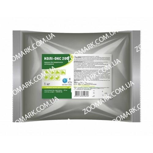 ОПИСПорошок від білого до світло-жовтого кольору.СКЛАД1 г препарату містить діючої речовини:окситетрацикліну гідрохлорид 100,0 мгколістину сульфат 1 200 000 ОД.ФАРМАКОЛОГІЧНІ ВЛАСТИВОСТІКолі-Окс 200 - комбінований препарат, який містить два антибіотики.Окситетрациклін - антибіотик, який належить до групи тетрациклінів. Механізм його дії полягає в пригніченні синтезу білків шляхом звязування з 30S рибосомальною субодиницею чутливих до препарату мікроорганізмів, тим самим, не допускаючи зєднання рибосом саміноацилтранспортної - РНК. Вважають також, що окситетрациклін назад звязується з 50S рибосомами і змінює проникність цитоплазматичної мембрани чутливих мікроорганізмів.Окситетрациклін володіє широким спектром дії на грампозитивні і грамнегативні мікроорганізми: Streptococcus spp., Clostridium spp., Corynebacterium spp., Brucella spp., Haemophilus spp., E. coli, Pasteurella spp., Klebsiella spp., Erysipelothrix spp., Fusobacterium spp., Salmonella spp., а також на найпростіші (Protozoa spp.), мікоплазми (Mycoplasma spp.), риккетсії (Rickettsia spp.) і хламідії (Chlamydia spp.).Колістину сульфат антибіотик групи поліміксинів, які синтезуються аеробною спороутворюючою паличкою Bacillus polymyxa. Він діє бактерицидно на грамнегативні бактерії (такі як E. coli, Salmonella spp., Pseudomonas spp.), звязуючись з фосфоліпідами цитоплазматичної мембрани, посилюючи її проникність як для внутрішньо-, так ї для зовнішньоклітинних компонентів, що призводить до деструкції клітинних барєрів.ПОКАЗАННЯ ДО ЗАСТОСУВАННЯЛікування свиней, домашньої птиці (бройлери та ремонтний молодняк, індики), ягнят, телят і козенят (від народження до 8 тижнів) при захворюваннях органів шлунково-кишкового тракту та органів дихання, які викликані мікроорганізмами, чутливими до окситетрацикліну та колістину.СКЛАДПерорально в дозі:- ягнята, телята та козенята(від народження до 8 тижнів) 0,5 г препарату на 10 кг маси тіла 2 рази на добу протягом 5-7 діб- свині, домашня птиця(бройлери та ремонтний молодняк, індики) 100 г препарату на 100-200 л води або 100 г препарату на 50-100 кг корму протягом 5-7 діб.Для приготування розчину необхідну кількість препарату насипають в невелику ємність і безперервно помішуючи наливають теплу воду. Приготований таким чином концентрат (препарат : вода питна 1:40) одразу додають до необхідної кількості питної води відповідно нормам потреби води для окремих вікових категорій тварин. Щоденно готують свіжий розчин препарату.ПРОТИВОПОКАЗАНИЯПідвищена чутливість до окситетрацикліну і колістину.Не застосовувати тваринам з порушенням функції нирок і печінки.Не застосовувати одночасно з антибіотиками, які мають бактерицидну дію, такими як пеніциліни, цефалоспорини, аміноглікозиди.Не застосовувати разом з нестероїдними протизапальними засобами.Не застосовувати курям-несучкам, яйця яких призначені для вживання в їжу людям.Не застосовувати жуйним тваринамз функціонально розвинутими предшлуночками.ЗАСТЕРЕЖЕННЯУ процесі змішування препарату з кормом необхідно обовязково використовувати засоби індивідуального захисту (респіратор, рукавички).Попередньо препарат випробовують на невеликій групі (7-8 голів) тварин. При відсутності ускладнень протягом 2-3 діб препарат застосовують всьому поголівю.Забій тварин на мясо дозволяється через 10 (свині, ягнята, телята, козенята) і через 7 (домашня птиця) діб після останнього застосування препарату. Отримане до зазначеного терміну мясо утилізують або