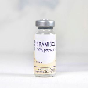 Левамізол гальмує фермент ацетилхолінестерази, впливаючи таким чином на нервово-мязову систему паразита, викликаючи скорочення його мязів і параліч.Він також гальмує метаболізм вуглеводів в організмі паразитів, блокуючи синтез АТФ.Левамізол ефективний проти дорослих і личинкових форм шлунково-кишкових нематод великої рогатої худоби та овець (Haemonchus spp, Ostertagia spp, Cooperia spp, Trichostrongylus spp, Nematodirus spp, Bunostomum spp, Oesophagostomum spp), легеневих нематод (Dictyocaulus spp. ), а також проти легеневих і шлунково-кишкових нематод свиней (Ascaris suum, Strongyloides ransomi, Metastrongylus spp. And Oesophagostomum spp).Показання до використання:Лікування гельмінтозних захворювань.Велика рогата худоба та вівці:шлунково-кишкові нематоди (дорослі та личинкові форми): Haemonchus spp, Ostertagia spp, Cooperia spp, Trichostrongylus spp, Nematodirus spp, Bunostomum spp, Oesophagostomum sppлегеневі нематоди: Dictyocaulus spp.Свині:шлунково-кишкові нематоди: Ascaris suum, Strongyloides ransomi, Oesophagostomum spp.легеневі нематоди: Metastrongylus spp.Спосіб застосування та дозиПрепарат вводиться підшкірно або внутрішньомязово, одноразово в дозах:Велика рогата худоба -0,75 мл (75 мг левамізолу) на 10 кг живої маси.Максимальна доза - 22,5 мл (2,250 мг левамізолу) на тварину живою масою понад 300 кг.Вівці -0,75 мл (75 мг левамізолу) на 10 кг живої маси. Максимальна доза - 4,5 мл (450 мг левамізолу) на тварину живою масою понад 65 кг.Свині -0,75 мл (75 мг левамізолу) на 10 кг живої маси. Тваринам живою масою понад 150 кг рекомендована доза становить 3,5 мл (350 мг левамізолу) на кожні 50 кг.Не перевищувати рекомендовані дози.ПротипоказанняНе рекомендується застосовувати хворим і ослабленим тваринам, особливо тваринам із захворюваннями печінки та нирок.Не призначають тваринам, які годують і вагітним тваринам в останні три місяці вагітності, а також поросятам живою масою до 10 кг.