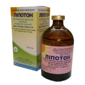 Прозора вязка рідина світло-жовтого кольору зі специфічним запахом.Склад : 1 мл препарату містить діючу речовину: Липофильное фракція тканин плаценти свиней 5 мг Допоміжні речовини: олія соняшниковаФармокологические дії : Препарат містить комплекс біологічно активних речовин: гексози, есенціальні фосфоліпіди, тригліцеридів, ненасичені жирні кислоти, вітаміни, мікроелементи. Гексози і тригліцеридів, що входять до складу липотону, забезпечують тканини харчуванням і енергією, покращує вуглеводний і ліпідний обмін. Фосфоліпіди, що є важливим структурним елементом клітинних мембран і мембран органел, регулюють проникність біомембран, активність мембраносвязанних ферментів, забезпечуючи фізіологічну норму процесів окисного фосфорилювання в клітинному метаболізмі.Природні антиоксиданти -вітаміни А і Е, що входять до складу чи потону, попереджають утворення вільних радикалів, які ушкоджують тканини організму. Препарат володіє імуностимулюючою дією, нормалізує показники клітинного і гуморального імунітету, має гепатопротекторну та мембранопротекторним діями, надає протизапальну дію, стимулює неспецифічну резистентність організму.Застосування : Для профілактики і лікування ендометритів і маститів у корів метрит-мастит-агалактія у свиноматок, затримки посліду, зміцнення імунної системи, для нормалізації ліпідного обміну, підвищення статевої функції виробників.Дозування : Перед застосуванням препарат розігріти до температури від + 36 до + 37 С. препарат вводять внутрішньомязово по наступній схемі: Перед застосуванням препарат розігріти до температури від + 36 до + 37 С.