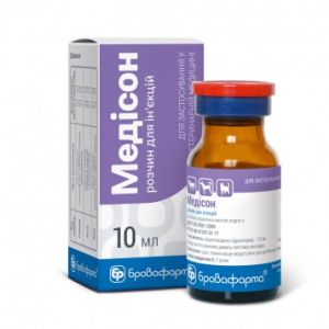 Склад1 мл препарату містить:медетомідину гідрохлорид 1 мгДля припинення седативної, анальгетичної дії препарату Медісон усобак та котіврекомендується застосовувати антидотРеверсон.ОписРідина безбарвна, прозора.Фармакологічні властивостіМедетомідин високоселективний антагоніст альфа-2-адренорецепторів широкого спектру дії. Має сильну центральну та периферичну симпатолітичну дію завдяки зниженню вивільнення норадреналіну із закінчень симпатичних нервів. Седативний ефект зумовлений гальмуванням збудження блакитної плями, основного норадренергічного ядра у стовбурі головного мозку. Діючи на цю ділянку, медетомідин проявляє седативний ефект, сила якого залежить від дози: малі дози дають помірний седативний ефект без анальгезії, великі виражений седативний ефект із анальгезією.Медетомідин викликає типові гемодинамічні зміни, опосередковані альфа-2-адренорецепторами, такі як брадикардія і артеріальна гіпотензія або гіпертензія. В малих дозах знижує частоту серцевих скорочень і артеріального тиску, а у великих дає судинозвужувальний ефект. При повільній інфузії знижує частоту серцевих скорочень і артеріальний тиск, а при швидкому введенні активізує позасинаптичні альфа-2-адренорецептори периферичних судин, в результаті чого переважають периферичні судинозвужувальні ефекти, а брадикардія стає більш вираженою.Після внутрішньомязового введення швидко всмоктується та розподіляється в організмі, максимальна концентрація в крові досягається через 15-30 хвилин. З білками сироватки крові звязується 85-90. Окислюється в печінці, невелика частина метилюється в нирках. Більшість метаболітів виводиться з сечею. Період напіввиведення становить 1-2 години.ПоказанняПрепарат застосовують:собакам для седації та анальгезії під час обстежень, діагностичних, профілактичних та лікувальних маніпуляцій, для премедикації перед загальним наркозом, загальною анестезією пропофолом або кетаміном, як седативний і анальгезуючий засіб (у комбінації з буторфанолом)котам для седації, індукції загальної анестезії при хірургічних втручаннях (у комбінації з кетаміном), седації та анальгезії (у комбінації з буторфанолом), загальної анестезії (у комбінації із буторфанолом і кетаміном)спортивним коням для седації та анальгезії під час обстежень, невеликих хірургічних втручань та діагностичних маніпуляцій, премедикації при інєкційному або інгаляційному наркозі.ПротипоказанняНе призначати тваринам із підвищеною чутливістю до діючої речовини препарату, захворюваннями серцево-судинної та дихальної системи, порушеннями функцій печінки та нирок, тваринам у шоковому стані, вагітним, лактуючим, виснаженим та ослабленим тваринам.Не застосовувати разом з амінами, що мають симпатоміметичну дію та антихолінергічними препаратами.Не призначати цуценятам віком до 12 тижнів та продуктивним тваринам.Спосіб застосування та дозиПрепарат вводять собакам внутрішньовенно, внутрішньомязово або підшкірно, котам внутрішньомязово або підшкірно, коням внутрішньовенно. Найшвидша дія настає після внутрішньовенного введення. Для подовження седативного та анальгетичного ефекту через 10-15 хвилин препарат можна ввести повторно.Дози препарату для різних видів тварин вказані у таблиці.Вид тваринСпосіб введенняМета застосуванняДоза препарату, мл 10 кг м