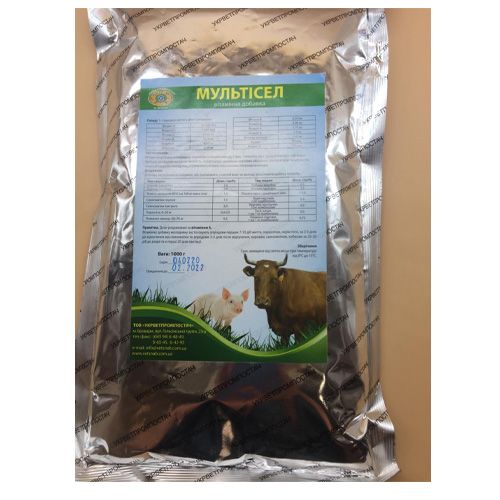 Порошок Мультисел це вітамінна добавка, яка застосовується для лікування великої рогатої худоби, коней, свиней та птиці.склад1 г порошку містить речовини, що діють (г):Вітамін А 20 000 МОВітамін D3 1000 MEВітамін С 20,00 мгВітамін В5 18,00 мгВітамін В3 6,00 мгВітамін Е 5,25 мгВітамін В2 2,50 мгВітамін В6 2,00 мгВітамін К3 1,75 мгВітамін В1 1,5 мгФолієву кислоту 0,40 мгСелен 33 мкгВітамін В12 7,5 мкгДопоміжні речовини:сахароза, діоксид кремнію.Фармакологічні властивостіДія продукту обумовлена властивостями вітамінів, що входять до його складу.Підтримує нормальну структуру та функціонування слизових дихальних шляхів, органів травлення та сечостатевої системи, зору, шкірних залоз.Підвищує резистентність до організму.Регулює фосфорно-кальцієвий, А- та D-вітамінний обміни.Забезпечує стійкість стінок капілярів та еластичність кровоносних судин.Позитивно впливає на зростання, розвиток та продуктивність сільськогосподарських тварин та птиці.Вітаміни групи В необхідні обміну жирів, білків і вуглеводів, а також мають важливе значення для забезпечення функцій нервової системи, серцевої діяльності та ендокринних залоз.Селен запобігає розвитку дистрофії печінки, підвищує її детоксикаційну функцію, посилює дію вітаміну Е, бере участь у процесах активного дихання тканин та фосфорилювання, впливає на швидкість окисно-відновних процесів.Позитивно впливає на зростання та розвиток молодняку тварин.Продукт покращує обмін речовин в організмі, підвищує продуктивність, зміцнює захисні функції організму.Показання до застосуванняПорошок Мультисел використовується для лікування великої рогатої худоби, коней, свиней та птахів.Вітамінна добавка Мультисел:попереджає розвиток А-гіповітамінозу та стресстимулює зростання, продуктивність, відтворюючі функції, неспецифічну резистентністьпрофілактує ураження слизових, респіраторні та шлунково-кишкові хвороби молодняку, спричинені умовно-патогенними мікроорганізмами.ПротипоказанняНе встановлені.Побічна діяНе виявлено.Особливості використанняПри використанні враховувати вміст вітамінів у раціоні.Використання під час вагітності, лактації, несучостіБез обмежень.Взаємодія з іншими засобами та інші форми взаємодіїНевідома.Дози та способи введення тваринам різного вікуДобавку застосовують з кормом або розчиняють у воді чи молоці з огляду на добову потребу.Вид тваринДоза, гдобаКорови сухостійкі5,0Кобили жеребні2,5Корови лактуючі8,0Кобили лактуючі3,5Телята, молодняк ВРХ (на 100 кг маси тіла)1,5Лошата одно-, дворічного віку1-1,5Поросята свиноматки1,5Кури-несучки, гкг комбікорму0,5Свиноматки лактирующие2,0Курчата, молодняк, гкг комбікорми0,5Поросята, 6-20 кг0,4-0,5Гуси, качки, г на 1 кг комбікорму0,5Племінні свинки, 50-70 кг0,5Племінні індички, г на 1 кг комбікорму0,75Дози розраховані за вітаміном А.Вітамінну добавку Мультисел застосовують:молодняку протягом перших 7-10 діб життяпоросятам протягом перших 7-10 діб життя, за 3-5 днів до відлучення від свиноматки та протягом 3-5 днів після відлученнякоровам, свиноматкам, кобилам за 20-30 діб до пологів та у перші 20 днів лактації.Передозування (симптоми, невідкладні заходи, антидоти)Невідомі.Спеціальні застереженняНі.Період виведення (коренції)Відсутня.Умови зберігання та термін придатностіЗберігати у сухому, недоступному для дітей, захищеному від світла місці при температурі від 8С до 15С.Термі