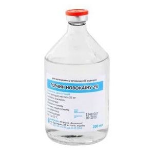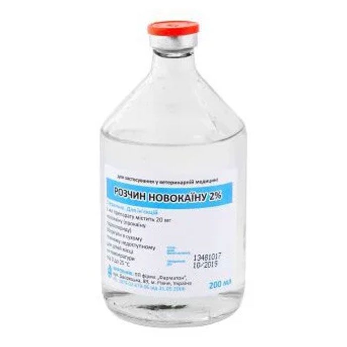 Безбарвний розчин для інєкцій та інфузій.Склад:1 мл препарату містить діючу речовину: новокаїн - 100 мг, вода для інєкцій - до 1 млФармакологічні властивості:Новокаїн має широку терапевтичну дію. При всмоктуванні в кров новокаїн зменшує утворення ацетилхоліну, знижує збудливість периферичних холинреактивних систем, блокуючий вплив на вегетативні ганглії, зменшує спазми гладкої мускулатури, знижує збудливість серцевого мяза і моторних ділянок кори головного мозку. Через інтерорецептори новокаїн впливає на перебудову вегетативної іннервації, обумовлює тривалу терапевтичну дію препарату. В організмі новокаїн гідролізується з утворенням параамінобензойної кислоти і диетиламиноетанола. Параамінобензойна кислота є складовою частиною молекули фолієвої кислоти, володіє антигістамінним і антисульфаниламидним дію, бере участь у процесах детоксикації. Диетиламиноетанол має помірну судинорозширювальну дію. Місцево препарат проявляє швидке і короткочасна анестезуюча дія.Застосування:для лікувальних блокад при випаданні матки і піхви, затримці посліду у корів і кіз та овець, при серозно-катаральних маститах.Дозування:Препарат вводять внутрішньочеревно, в таких дозах:велика рогата худоба - 10 млвівці, кози - 1,2 млПрепарат вводять одноразово, попередньо підігрів його до температури 35-37С. Можливе повторне застосування препарату у тих же дозах через 48-72 години.Протипоказання:Індивідуальна підвищена чутливість до новокаїну, гіпотензія, гнійний процес у місці введення. Препарат несумісний з лугами, окислювачами, солями важких металів, сульфаніламідами, гексаметилентетраміном.Період виведення (каренция):Продукція тваринництва використовується без обмежень.Форма випуску:Флакони по 200 млЗберігання:Сухе, темне, недоступне для дітей місце при температурі від 5 до 25 С. Препарат зберігати окремо від харчових продуктів, напоїв, в тому числі від корму для тварин.Термін придатності: 2 роки з дати виготовлення. Після першого відбору препарат необхідно використати протягом 48 годин за умови зберігання в оригінальній упаковці при температурі від 4 до 8 С.