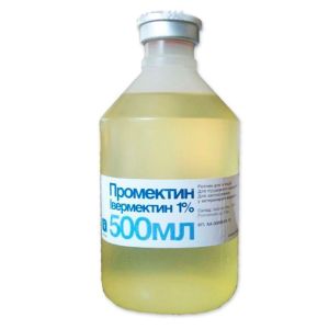 Промектин ИнвесаФармакологическое дія:Володіє широким спектром противопаразитарного дії, активний проти нематод шлунково-кишкового тракту і легенів, збудників оводових інвазій, ентомозов і саркоптоидозов. Механізм дії препарату полягає в порушенні передачі нервових імпульсів у паразитів, що призводить до їх паралічу і загибелі. Препарат малотоксичний для теплокровних тварин, в рекомендованих дозах не має сенсибілізуючої, мутагенної, ембріотоксичної і тератогенної дії. Виводитися з організму з сечею і жовчю, у лактуючих тварин також з молоком.Показання:Великій рогатій худобі і вівцям при диктиокаулез, остертагіозе, гемонхоз, тріхостронгілезе, коопериозе, хабертиозе, протостронгилезе, езофагостомоз, нематодирозе, буностомоз, стронгілоїдозі, сифункулятозах, гиподерматозе, естрозе, псороптозе і хориоптозе свиням при аскаридозі, езофагостомоз, трихоцефальозі, стронгілоїдозі, метастронгілезе, саркоптоз і гематопінозе.Дози і спосіб застосування:Препарат вводять тваринам з дотриманням правил асептики великій рогатій худобі підшкірно в ділянку передпліччя, вівцям задню третину шиї в дозі 1 мл ганамектина на 50 кг маси (200 мкг діючої речовини на 1 кг маси) тварини свиням в область потилиці в дозі 1 мл ганамектина на 33 кг маси (300 мкг івермектину на 1 кг маси) тварини. Препарат застосовують тваринам одноразово, у важких випадках захворювання псороптозом овець дворазово з інтервалом 7 днів. Для забезпечення точного дозування препарату, особливо при його застосуванні тваринам невеликої маси, рекомендується використовувати шприц з точністю введення до 0,1 мл При введенні препарату у обсязі, що перевищує 10 мл, інєкції слід проводити в кілька місць. Обробку тварин проти гельмінтозів проводять перед постановкою на стійлове утримання і навесні перед вигоном на пасовище, проти оводових інвазій відразу після закінчення літа оводів, при саркоптоидозах і ентомозах за показаннями. Кожну партію препарату попередньо випробовують на невеликій групі (7 10 голів) тварин. При відсутності ускладнень протягом 2-3 днів приступають до обробки всього поголівя.Побічні дії:У рекомендованих дозах не спостерігаються. У окремих тварин після введення препарату можлива поява місцевої больової реакції, яка спонтанно зникає і не вимагає застосування терапевтичних засобів.Протипоказання: Токсичний для риб і бджіл. Не дозволяється застосування дійним, ослабленим і виснаженим тваринам, а також вагітним коровам і вівцям за 28 днів до отелення (окоту).Особливі вказівки:Забій на мясо оброблених препаратом тварин дозволяється через 28 днів після останньої обробки. В случае винужденного убоя животних ранее установленного срока, мясо может бить использовано в корм зверям или для переработки на мясо-костную муку. При работе с препаратом следует соблюдать общие правила личной гигиени и техники безопасности, предусмотренние для ветеринарних препаратов. Пустие флакони из-под препарата запрещается использовать для битових целей, они подлежат утилизации сжиганием. Загрязненние препаратом участки рабочих мест и транспорта нейтрализуют 5 раствором гидроокиси натрия.
