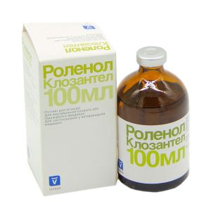 СкладАнтипаразитарний препарат, що містить в 1 мл в якості діючої речовини 50 мг Клозантел. За зовнішнім виглядом являє собою прозорий розчин жовтого кольору. Випускають у формі стерильного розчину для інєкцій, розфасованим по 100 і 250 мл у флакони з темного скла, упаковані в картонні коробки.Фармакологічні властивостіРоленол відноситься до групи проти паразитарних препаратів широкого спектра дії. Клозантел, що входить до складу препарату, активний відносно статевозрілих і личинкових фаз розвитку нематод, включаючи Bunostomum spp., Haemonchus spp., Oesophagostomum radiatum, Chabertia ovis, статевозрілих і статевонезрілих трематод Fasciola heparica, статевозрілих трематод Fasciola gigantica, а також личинок оводів Hypoderma bovis , Hypoderma lineatum, Oestrus ovis, що паразитують у великої рогатої і дрібної рогатої худоби. Механізм дії Клозантелу полягає в зміні процесів фосфорилювання і перенесення електронів, що призводить до порушення енергетичних обмінних процесів гельмінтів і їх загибелі. Після парентерального введення препарату Клозантел швидко всмоктується з місця інєкції та проникає в більшість органів і тканин, досягаючи максимальних концентрацій через 24 години. У терапевтичній концентрації Клозантел зберігається в організмі до 10 діб, виводиться з організму переважно з жовчю в основному в незмінному вигляді, у лактуючих тварин - частково з молоком. Препарат помірно небезпечний для теплокровних тварин, в рекомендованих дозах не має ембріотоксичних і тератогенних властивостей.Показання до використанняПризначають з лікувальною і профілактичною метою великій рогатій худобі при фасциольозі, буностомозі, гемонхозі, езофагостомозі, тріхостронгільозі, остертагіозв і гіподерматозі, вівцям і козам - при гемонхозі, езофагостомоіз, тріхостронгільозі, нематодірозі, хабертіозі, буностомозі, фасциольозі і естрозі.Спосіб застосуванняВводять одноразово, великій рогатій худобі підшкірно або внутрішньомязово, дрібній рогатій худобі - підшкірно. Перед використанням флакон з препаратом необхідно ретельно струснути. Великій рогатій худобі роленол застосовують для профілактики і лікування фасциольозу, викликаного личинковою і статевозрілою стадією Fasciola hepatica і статевозрілою стадією Fasciola gigantica, а також при нематодозах, викликаних личинковими і дорослими стадіями Bunostomum spр., Haemonchus placei, Oesophagostomum radiatum в дозі 0,5 мл 10 кг маси тварини, при гіподерматозі - в дозі 1 мл10 кг маси тварини. Дрібній рогатій худобі роленол застосовують для профілактики і лікування нематодозів, викликаних личинковими і дорослими стадіями Bunostomum spp., Haemonchus placei, Oesophagostomum radiatum, Chabertia ovis, і естроз овець, викликаного личинками Oestrus ovis, в дозі 0,5 мл10 кг живої маси фасциольоза, викликаного личинковою та дорослою стадією Fasciola hepatica - в дозі 1 мл 10 кг живої маси. Обробки проти гельмінтів проводять перед постановкою тварин на стійловому утриманні і навесні перед вигоном на пасовище проти оводових інвазій - відразу після закінчення літа і навесні (березень - квітень). Перед масовими обробками кожну партію препарату попередньо випробовують на невеликій групі тварин (5 - 7 голів), за якими ведуть спостереження впродовж 2-3 днів. При відсутності ускладнень препарат застосовують всьому поголівю тварин.Побічна діяУ рекомендованих дозах не спостерігаються. При підшкірному введенні в окремих випадках в місці інєкції можлива поява припухлості, яка м