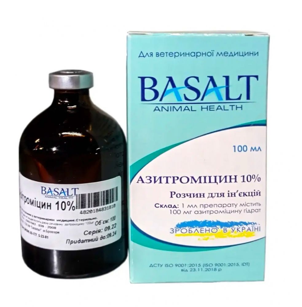 За зовнішнім виглядом препарат являє собою прозорий розчин жовтого або жовтуватого кольору.Склад1 мл препарату містить 100 мг азитроміцину як діючу речовину, а також допоміжні компоненти.Фармакологічні властивостіАзитроміцин антибіотик групи макролідів (підгрупи азалідів) широкого спектра дії. Має бактерицидну та бактеріостатичну дію відносно грамнегативних (Actinobacillus lignieresi, Haemophilus spp, Moraxella spp, Bordetella spp, Campylobacter spp, Legionella pneumophila, Salmonella spp, Escherichia spp), грампозитивних (Listeria spp, Staphylococcus aureus, Staphylococcus spp, Streptococcus spp, Streptococcus pneumoniae, Streptococcus pyogenes, Enterococcus faecalis, Erysipelothrix insidiosa), а також деяких анаеробних бактерій (Clostridium perfringens, Fusobacterium spp, Pasteurella haemolytica, Pasteurella multocida, Haemophilus parasuis), мікоплазм (Mycoplasma pneumoniae), хламідій (Chlamydia pneumoniae) і спірохет (Borrelia spp).Механізм дії полягає у пригніченні синтезу білка рибосомами бактерій, що перешкоджає утворенню пептидних звязків.Показання до застосуванняПризначають великій та дрібній рогатій худобі, свиням, собакам і котам для лікування:інфекцій дихальної, травної та сечостатевої систем,інфекцій шкіри та мяких тканин,некробактеріозу, бешихи свиней, спірохетозу, мікоплазмових інфекцій.Спосіб застосуванняВелика і дрібна рогата худоба, свині: внутрішньомязово у дозі 1 мл на 20 кг маси тіла (5 мгкг), інтервал між інєкціями 7296 год.Собаки та коти: 1 мл на 10 кг маси тіла при лікуванні змішаних інфекцій.Після інєкції препарат швидко проникає у вогнище запалення, досягаючи високих концентрацій протягом 30 хв та зберігаючи активність у легенях до 7 днів.ОбмеженняНе застосовувати тваринам з підвищеною чутливістю до макролідів.Побічні діїМожливі блювання та метеоризм.Форма випускуСтерильний розчин у скляних флаконах по 5, 10, 50 та 100 мл.ЗберіганняУ сухому, темному місці при температурі +15+25 С.Термін придатності2 роки.