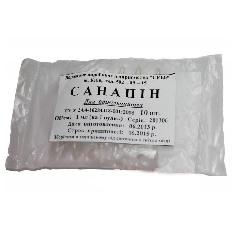 Багатофункціональний антимікробний препарат c фунгіцидними, дезінфікуючими та детоксикующими властивостями.СвойстваСанапин лікарська форма биокислородних металлосиликатних сполук (БМСС).Препарати группиБМССобладают вираженими протимікробними, фунгіцидними і детоксикующими властивостями, вони високоефективні щодо спороутворюючих і неспороутворюючих мікроорганізмів.Санапинприменяют при мікробних, вірусних і грибкових хвороб бджіл, а також для знешкодження пестицидів потрапили у вулик з нектаром і пилком.Дози і спосіб застосування: Середня норма расходаСанапина- 1 ампула (1мл) на один стандартний вулик. В залежності від забруднення кількість препарату може бути збільшена до 2-4 мл з розрахунку на 1 куб. м обєму оброблюваного.Перед обробкою необхідно провести повну герметизацію вулика (закрити літки, щілини тощо), при цьому повну гігієнічне прибирання проводити необовязково. Рамки з бджолами і кормом залишаються в оброблюваному вулику.Роздушіть ампулу з препаратом на металеву підкладку і швидко помістіть е в підрамковий простір. Час експозиції (витримки) 30-40 хвилин. Після обробки вулик провітрюють протягом 15-20 хвилин.При необхідності процедуру можна повторити через 7 - 14 днів залежно від стану бджіл і ступеня забруднення вулика. Для санации и дезинфекции Санапин применяется два раза на протяжении сезона, как правило весной и осенью.Для лечения пчел от аспергиллеза Санапин применяют два раза, с интервалом в 21 день.При вирусном параличе - 2- 3 раза через 8-10 дней.Противопоказания:нельзя использовать Санапинвместе с другими препаратами, действующими на пчел аналогичним образом.Предостережения: во время обработки Санапином запрещается курить и работать с откритим огнем. Уникайте попадання рідкого препарату в очі і на бджіл.Упаковка: скляні ампули по 1 мл Термін зберігання: 2 роки при кімнатній температурі в захищеному від світла