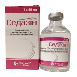 Розчин для інєкцій для худоби, коней, собак і котовИнструкция по застосуванню ветпрепарата СЕДАЗИН (SEDAZIN)СКЛАД: Xylazinum 20 мгAqua pro iniectione ad -1 mlОСОБЕННОСТИКсилазин є похідним тиазина, належить до групи антагоністів рецепторів альфа2 адренергичних. Володіє заспокійливим, аналгетичну, і розслаблюючим скелетні мязи дією. Заспокійливий та анальгетичну дію ксилазину зумовлене стимуляцією рецепторів альфа2 -адренергичних в центральній нервовій системі. Ефект, розслабляючий скелетні мязи, є наслідком блокування междунейронного проходження збудження в кругообращеніе. Ефект розслаблення мязів з різною інтенсивністю утримується протягом усього періоду тривалості дії заспокійливого ефекту.ПОКАЗАНИЯКсилазин використовується для заспокоєння тварин, знеболювання, миоре-лаксации, а також як засіб для премедикації. Застосування ксилазину полегшує огляд перевозбужденних тварин, застосування ліків, дає можливість проведення короткочасних хірургічних операцій.ПРОТИПОКАЗАННЯ хвороби систем поводження і дихання виявлена вагітність (небезпека викидня), за винятком пологів цукровий діабет (ксилазин знижує рівень інсуліну) непрохідність кишкового тракту у собак і котовПОБОЧНЫЕ ЯВЛЕНИЯЗатрудненное дихання з супутнім ацидозом. Брадикардія, гіпотензія, атаксія у великих тварин, рясне потовиділення у коней, часте сечовипускання. У жуйних може проявитися ослаблення перистальтики і тимпанію (здуття), а у собак і котів блювота, іноді пронос. При внутрішньомязовому або підшкірному введенні можуть проявитися місцеві набряки, звичайно зникають через 48 годин.ВЗАЄМОДІЇ З ІНШИМИ ПРЕПАРАТАМИПрепарати з центральним нейродепрессивним впливом (анестетики, анальгетики) посилюють дію ксилазину. Ксилазин не слід поєднувати з тіобарбітуратамі та галотаном, так як це може призвести до порушень серцевого ритму.ДОЗУВАННЯ І ПРИМЕНЕНИЕПри застосуванні слід врахувати індивідуальні особливості організму тварини.Худобу внутрішньомязово: 0,25 -1,5 мл на 100 кг маси тіла (тобто 50-300 мг ксилазину кг маси тіла). Внутривенно: 0,8 0,5 мл 100 кг масси тела (то есть 16-100 мг ксилазина кг масси тела)Лошади внутримишечно: 7,5-15 мл 100 кг масси тела (то есть 1,5-3 мг ксилазина кг масси тела) Внутривенно: 3-5 мл 100 кг масси тела (то есть 0,6-1 мг ксилазина кг масси тела)Собаки внутримишечно, подкожно или внутривенно: 0,15 мл кг масси тела (то есть З мг ксилазина кг масси тела)Коти внутримишечно или подкожно: 0,15 мл кг масси тела (то есть 3 мг кг масси тела). Действие ксилазина начинается через 5 -10 минут после внутримишечной инъекции, а после внутривенной через 3-5 минут. Обезболивающий еффект удерживается в течение 10 -15 минут, а успокаивающий 0,5-4 часа в зависимости от вида животного. После внутримишечной инъекции еффект удерживается дольше. Частичного ослабления еффекта действия ксилазина можно достичь употреблением центральних антагонистов рецепторов альфа2 адренергичних: йохимоини в дозе 0,1 0,2 мг кг масси тела iv или толазолина в дозе 0,5 -1,0 мг кг масси тела iv. При внутрішньовенному введенні препарат слід підігріти до температури тіла тварини і вводити повільно.ОГРАНИЧЕНИЯСъедобние тканини 7 днів.Не застосовувати для корів у період лактації.УМОВИ ХРАНЕНИЯХранить в темному місці при температурі від 4 с до 8С.ТЕРМІН ГОДНОСТИ2 року.