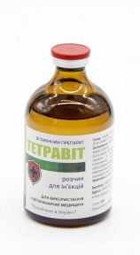 Опис: розчин для інєкцій світло-жовтого кольору.Склад: вітамін А - 50 тис. МО, вітамін Д3 - 25 тис. МО, вітамін Е - 20 мг, вітамін F - 5 мг, наповнювач - до 1 мл.Фармакологічні властивості: Тетравіт комплексний полівітамінний препарат, який застосовується для корекції та нормалізації обмінних процесів у тварин.Вітаміни, що входять до складу препарату, беруть участь у біохімічних процесах в організмі тварин.Вітамін А забезпечує функціонування мембран клітин, підтримує формування епітеліальних клітин слизових оболонок органів дихання, травлення, сечостатевої системи, потових і сальних залоз, забезпечує функціонування органу зору, репродуктивну функцію, має антиоксидантні властивості.Вітамін Д3 відіграє ключову роль у формуванні органічного матриксу кісткової тканини, його мінералізації, абсорбції кальцію та фосфору в кишечнику та їх реабсорбції з первинної сечі в канальцях нирок, метаболізмі кальцію, фосфору та магнію, підтримці їхнього гомеостазу.Вітамін Е має антиоксидантні властивості, попереджає зростання інтенсивності пероксидного окислення ліпідів, забезпечує структурно-функціональну стабільність клітинних мембран, активує синтез гему, який входить до складу міо-і гемоглобіну, каталаз і пероксидаз.Вітамін F бере участь у біосинтезі ліпідів, як структурних, так і функціональних, має протизапальні, антигістамінні та регенераторні властивості.Застосування: призначають усім видам тварин, собакам.Застосовують для нормалізації та стимуляції обмінних процесів, лікування та профілактики первинних та вторинних гіповітамінозів, підвищення резистентності до дії несприятливих факторів, стимуляції репродуктивної функції, симптоматичної терапії при хворобах різної етіології, підвищення інтенсивності росту тварин тощо.Дозування: Тетравіт застосовують внутрішньомязово або підшкірно, профілактично раз на 2-3 тижні, терапевтично раз на 7-10 діб.Поросним свиноматкам препарат вводять за 3-4 тижні до опоросу, тільних коров за 1-1,5 міс.до отелення.Одноразова доза одній тварині:Велика рогата худоба 5-6 млконі, дорослі свині 3-5 мл,Вівці, кози 1-2 мл,Телята, лошата 2-3 мл,Поросята-сосуни, підсвинки 1-1,5 мл.Собаки 0,2 1 мл, кролі 0,2 мл.індивідуальна чутливість до компонентів препарату, стан гіпервітамінозу.Каренція: продукцію тваринництва використовують без обмеження.