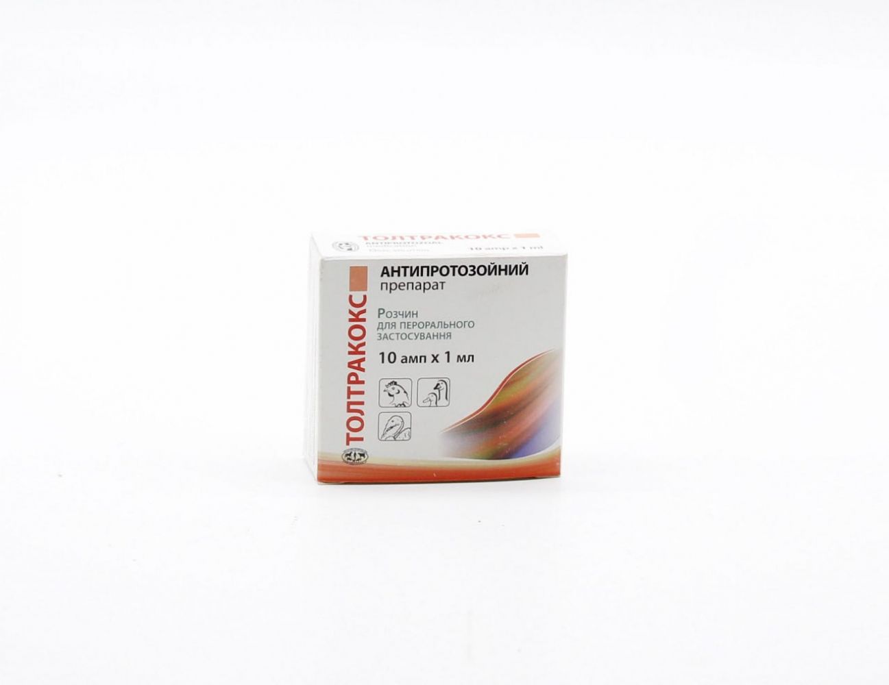 Склад100 мл препарату містить діючі речовини: толтразурил - 2,5 г триметоприм - 2,5 р.Фармакологічна діяСпектр антикокцидийного дії препарату Толтракокс ґрунтується на фармакологічному дії складових препарату - толтразурила і триметоприму. Поєднання толтразурила і триметоприму обумовлює синергетичний ефект при лікуванні кокцидіозу.Толтракокс ефективний відносно всіх видів еймерій (Eimeria acervulina, E. anceris, E. brunetti, Тобто necatrlx, E. mills, E. adenoides, E. truncata), які зустрічаються у домашньої птиці. Препарат проявляє антикокцидийное дію на всі стадії розвитку паразита, що проходять всередині клітини епітелію кишечника. Толтракокс помірно токсичний для птиці, не перешкоджає формуванню імунітету до кокцидиозу. Препарат сумісний з кормовими добавками, вітамінами і лікарськими препаратами для птиці.Толтразурил, який входить до складу препарату Толтракокс, відноситься до антикокцидийним препаратів групи триазинтриона. Він має еймериоцидним дію на всі стадії внутрішньоклітинного розвитку еймерій. Толтразурил блокує дихальні ферменти, пошкоджує мітохондрії і блокує процеси поділу ядра еймерій, порушуючи процес формування макрогаметоцита і викликає загибель паразита.Після перорального введення лікарського препарату толтразурил повільно всмоктується у шлунково-кишковому тракті, досягаючи максимальної концентрації у плазмі крові через 24 години. Біодоступність препарату становить 70. В організмі толтразурил метаболизиуется шляхом сульфоокисления і гідроксилювання з утворенням похідних сульфоксиду і сульфону.Виводиться толтразурил повільно (період напіввиведення близько 76 годин) у незмінному вигляді та у вигляді основного метаболіту сульфонової кислоти, головним чином, з фекаліями і частково із сечею.Триметоприм химиотерапевтиеский препарат, який має бактеріостатичну дію проти грампозитивних (Staphylococcus spp., Streptococcus spp., Clostridium spp., Corynebacterium spp. та інші) і грамнегативних мікроорганізмів (Е. coli, Salmonella spp., Klebsiella spp., Proteus spp., Pasteurelia spp., Bordetella spp. тощо). Він інгібує бактеріальну редуктазу, яка перетворює дигидрофолиевую кислоти в тетрагідрофолієву, необхідну для синтезу пуринів і піримідинів.Абсорбція триметоприму з травного каналу швидка і майже повністю (90-100). Звязування з білками плазми становить 45. Швидко розподіляється в тканинах та рідинах організму. Триметоприм проходить через плаценту, проникає в грудне молоко. Нирками виводиться 50-60 протягом 24 годин в основному шляхом клубочкової фільтрації і канальцевої секреції, причому 80-90 - у незмінному вигляді, решта - у вигляді неактивних метаболітів. Невелика кількість (4) виводиться з жовчю.ЗастосуванняЛікування і профілактика кокцидіозу бройлерів і ремонтного молодняку курей, індиків, гусей і качок.ДозуванняДля перорального применения с питьевой водой:1 мл препарата на 1 л питьевой води при постоянном випаивании на протяжении 48 часов или3 мл препарата на 1 л питьевой води по 8 часов в сутки, 2 суток подряд.Это соответствует дозировке 7 мг толтразурила и 7 мг триметоприма на 1 кг масси тела в сутки, 2 суток подряд.При необходимости (в тяжелих случаях заболевания) курс лечения повторяют через 5 суток.Раствор препарата сохраняет свои свойства на протяжении 48 часов. При появлении осадка раствор перед использованием нужно перемешать.Примечаниеу період лікування птиці необхідно давати воду з препаратом кач